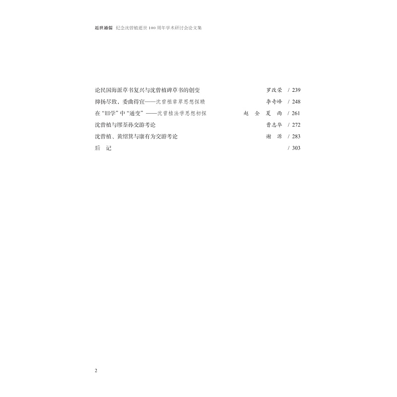 本书系纪念沈曾植逝世100周年的学术研讨会论文集。 2022年是沈曾植逝世100周年,为纪念这位国学大儒、书法大家,嘉兴于2022年11月举办了纪念沈曾植逝世100周年学术研讨会。研讨会由嘉兴市文化广电旅游局、嘉兴市文联主办,嘉兴博物馆、嘉兴市文保所、嘉兴市书协承办,嘉兴南湖学院支持。研讨会收到了众多沈曾植学者和高校学生的研究论文,论文主题包括沈曾植的书法、诗词、国学、收藏、诗学、交游、佛学等各个方面。经专家评选,从中挑选出30篇论文,集结成册出版。