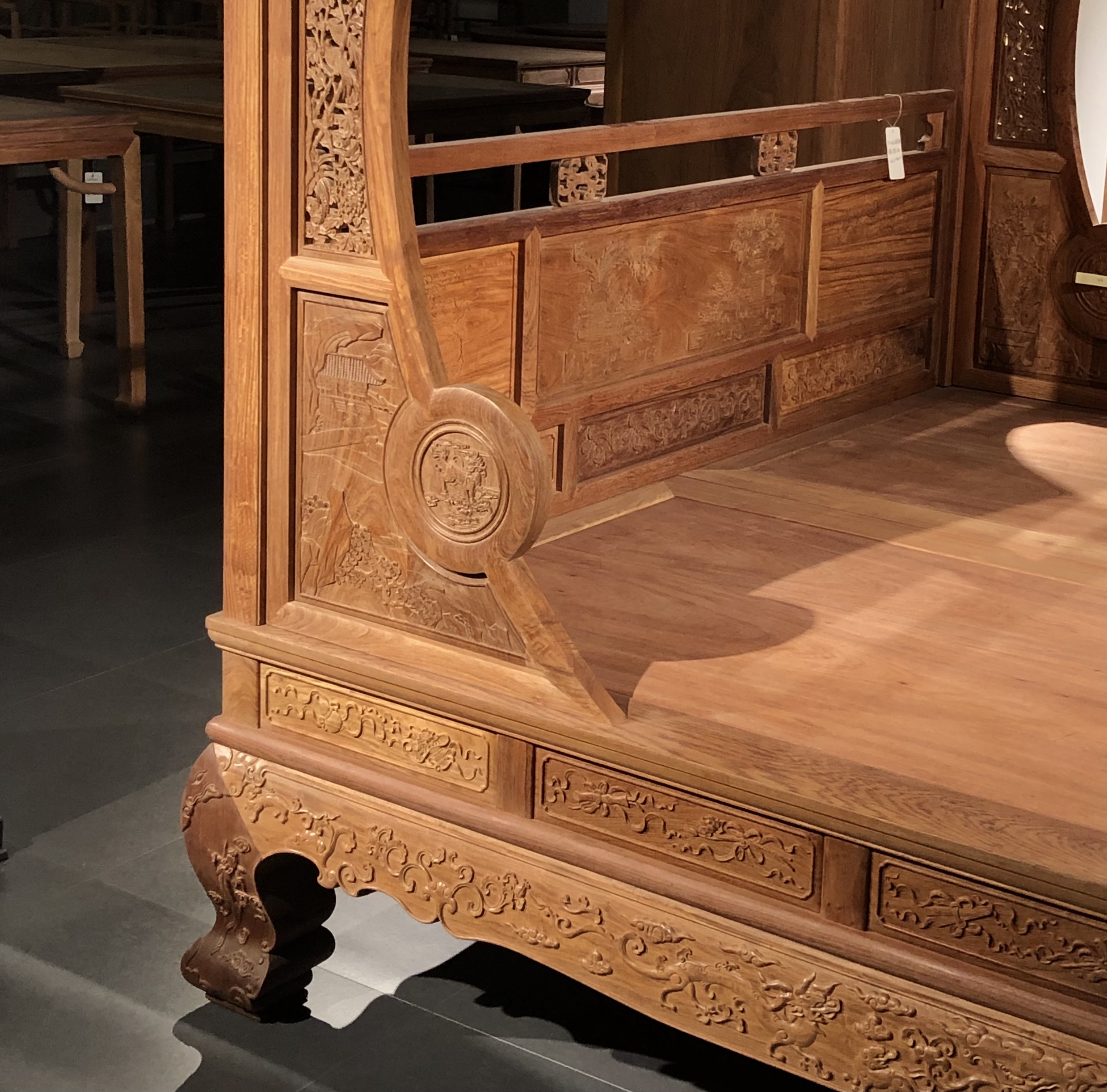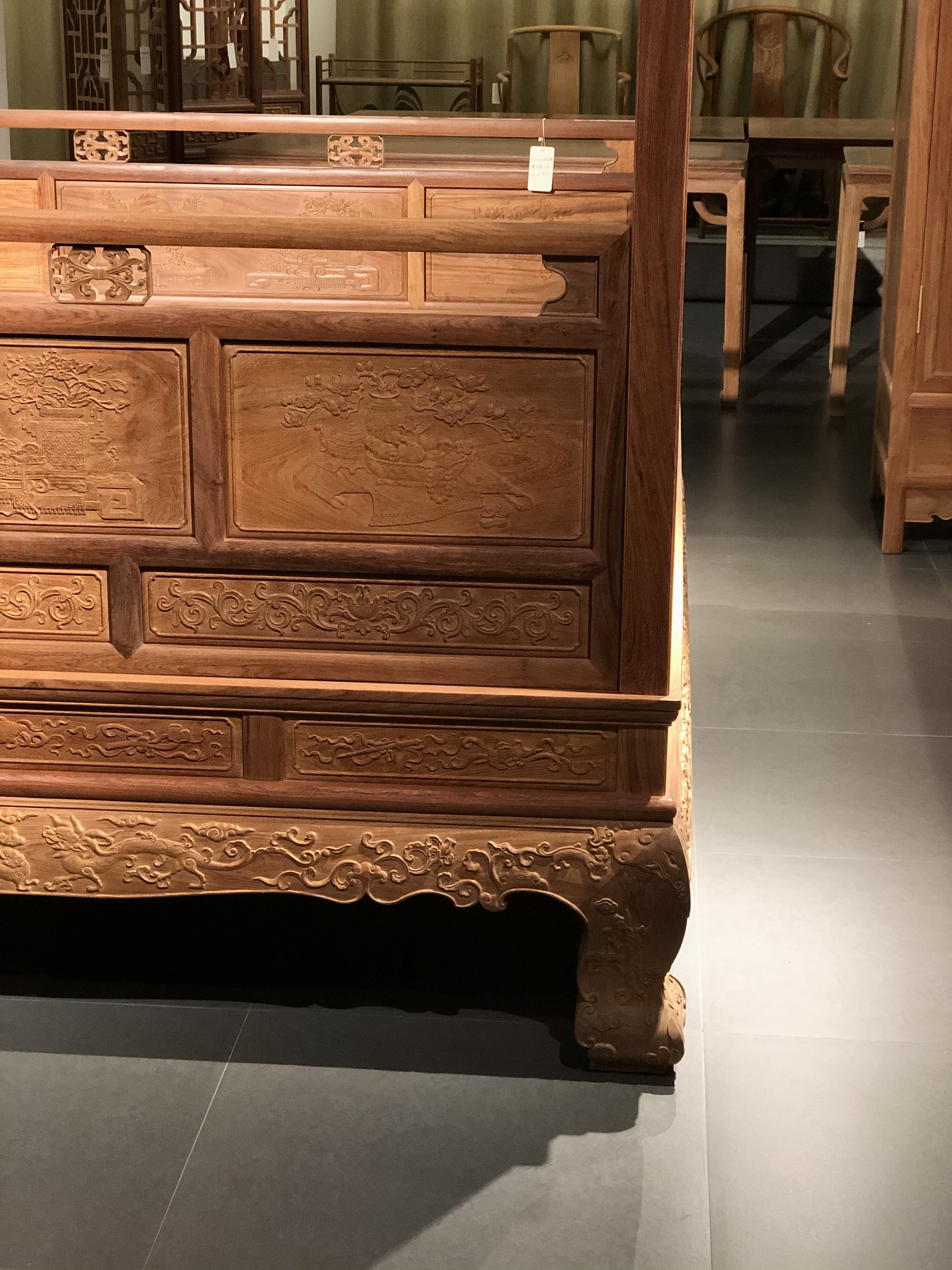 此款双月洞门罩架子床,前后门罩相同,围子上部透雕四季花鸟浮雕图案,而下部浮雕博古图案,上虚下实,给人以稳重感,牙板之上采用高束腰的做法,此床雕刻手法繁多,工艺严谨,耗时不菲,对木工技术要求也是极高,遂显技高艺美。