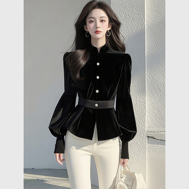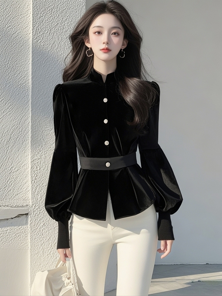 雀说爆款气质黑色丝绒上衣新款小众设计感收腰内搭衬衣AL9481
