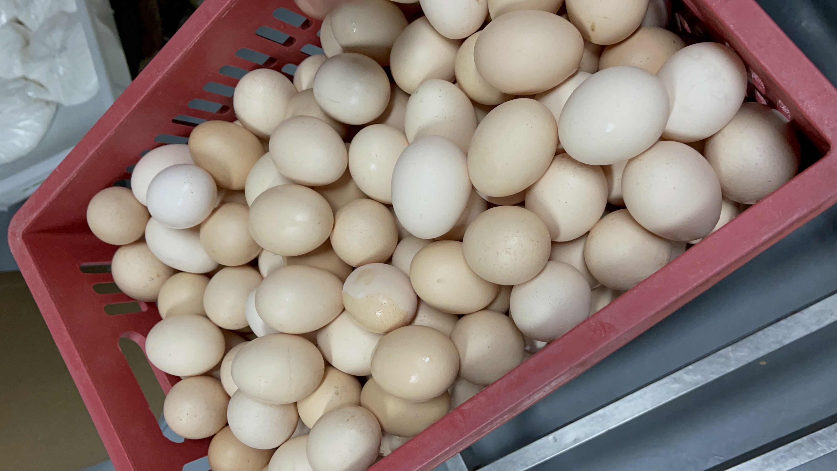 ④使用当天送到的新鲜农场蛋,浸泡消杀,人工挑选、打蛋。