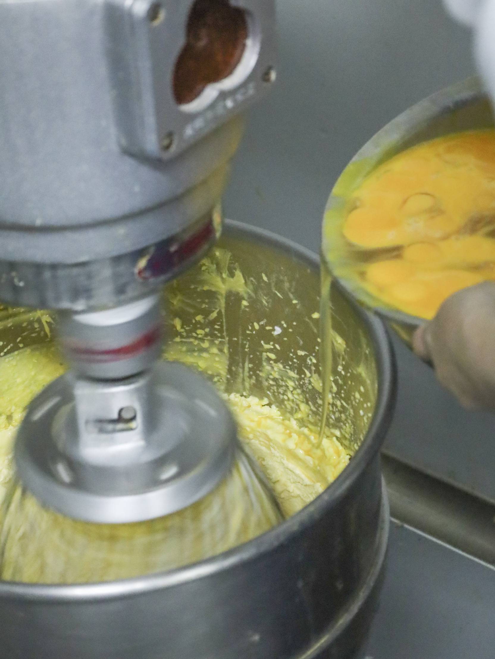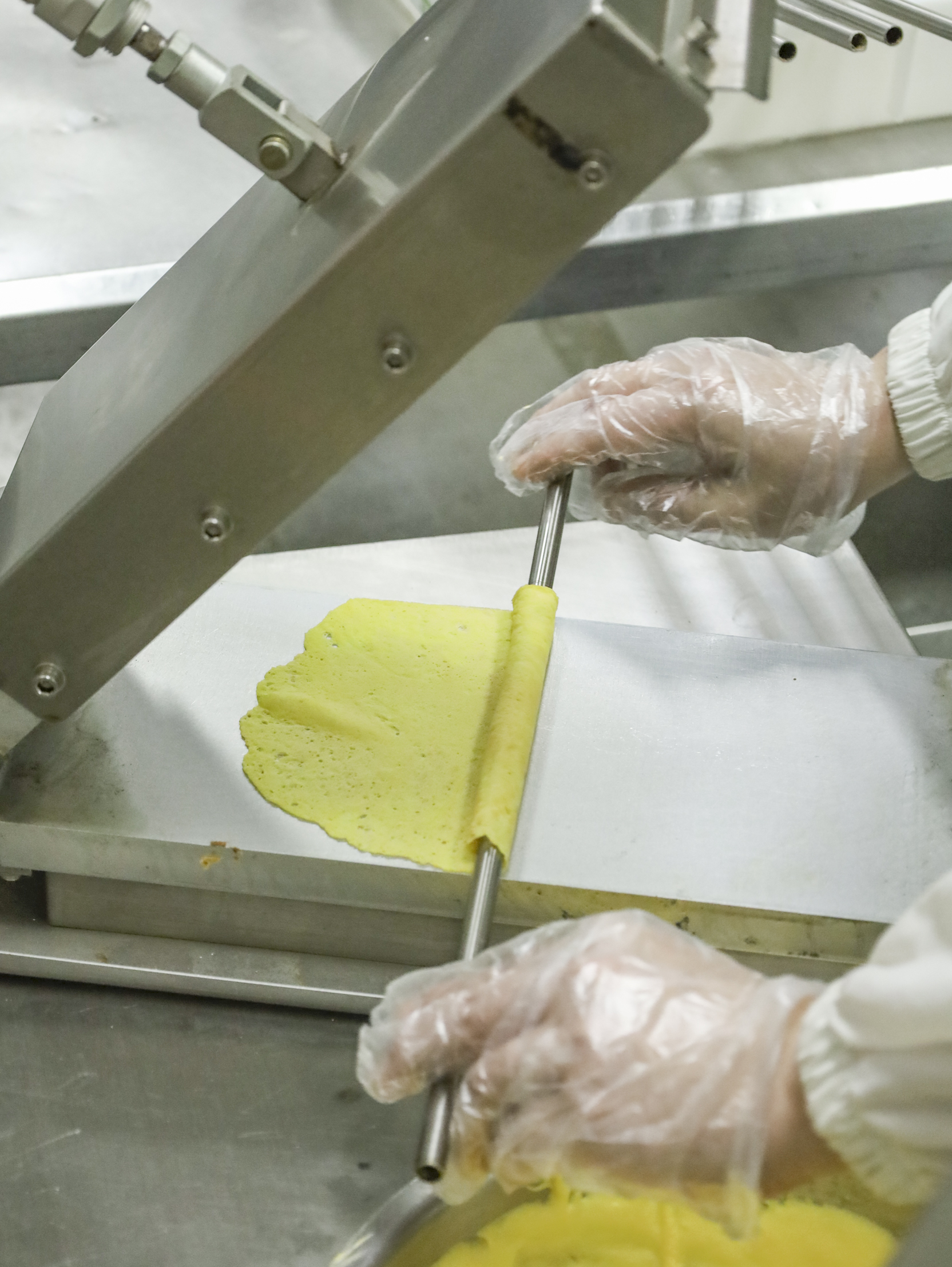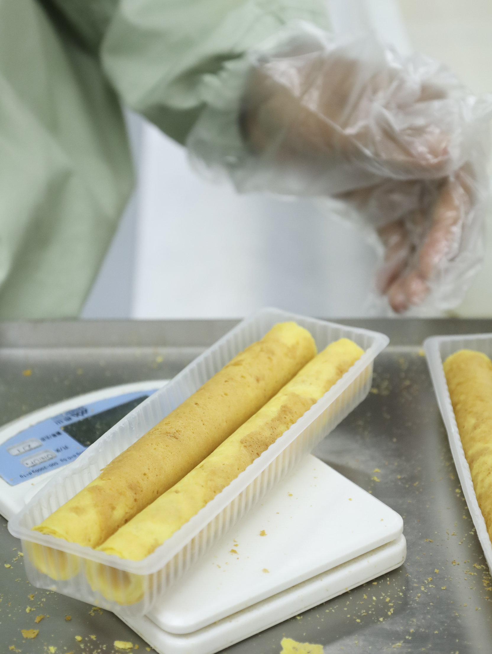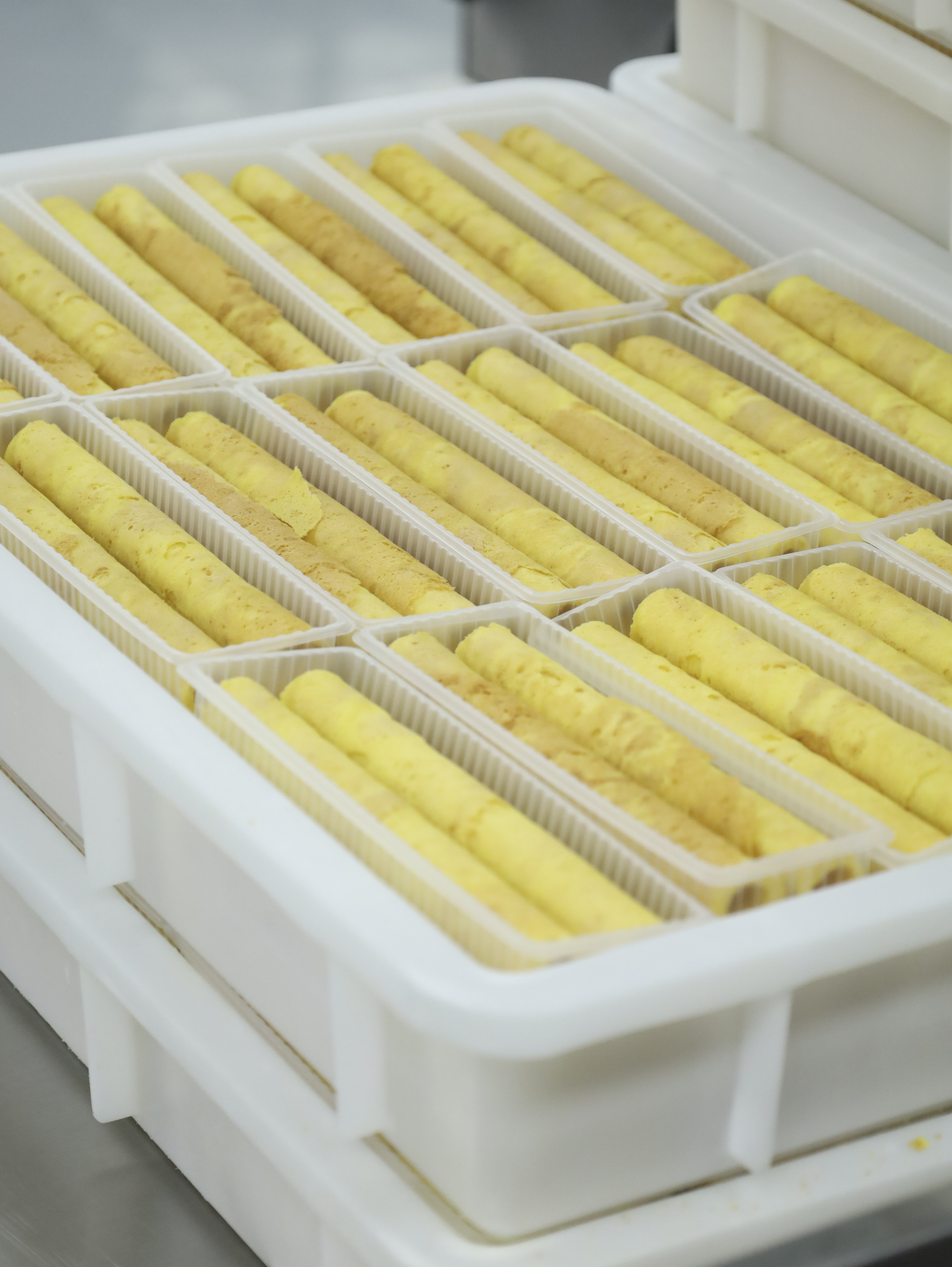 新鲜农场鸡蛋:每天由农场新鲜运到的鸡蛋,经由自家特殊浸泡、消杀,人工挑选,打蛋。出品比无菌蛋更香,且排除差蛋、坏蛋,保证每一根蛋卷的统一品质。