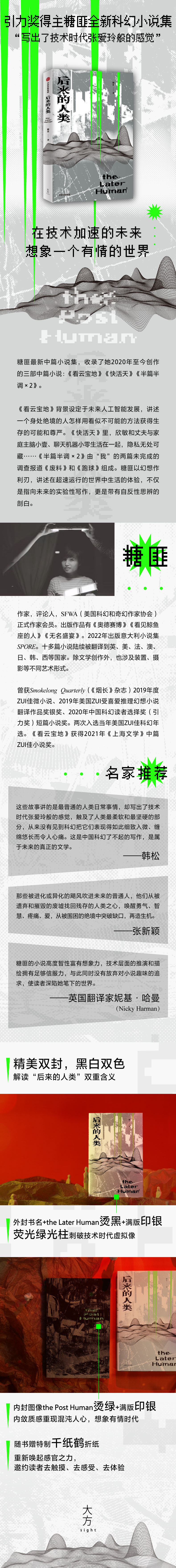 《后来的人类》收录了糖匪2020年至今创作的三部中篇小说:《看云宝地》《快活天》《半篇半调×2》。