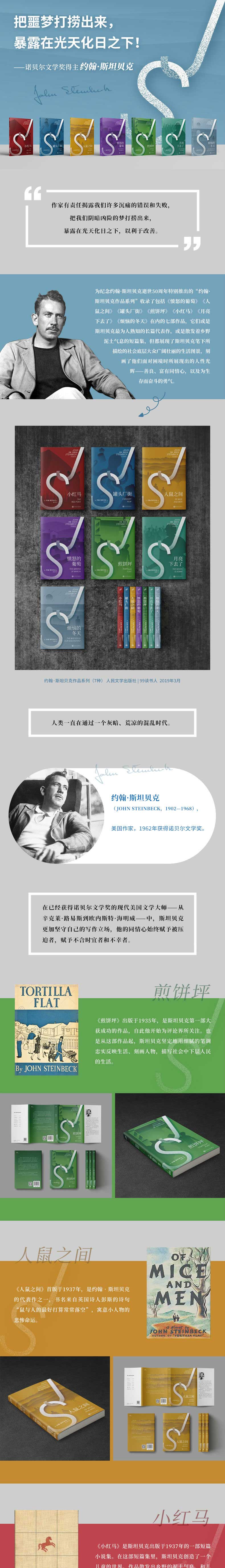 为纪念约翰·斯坦贝克逝世50周年特别推出的“约翰·斯坦贝克作品系列”收录了斯坦贝克的七部作品,包括《愤怒的葡萄》《人鼠之间》《罐头厂街》《煎饼坪》《小红马》《月亮下去了》《愤怒的冬天》,其中《愤怒的葡萄》是斯坦贝克著名的代表作,是一部史诗式的叙事作品,获得1939年的美国国家图书奖和1940年的普利策奖;《人鼠之间》和《罐头厂街》是他的另外两部代表作;《煎饼坪》是斯坦贝克一部大获成功的作品,自此他开始为评论界所关注;《小红马》则是一部散发着乡野泥土气息的短篇集,清新可喜;《月亮下去了》充满理想主义光辉,是一部反法西斯主义的佳作;《烦恼的冬天》给瑞典文学院的评委们留下深刻的印象,对斯坦贝克于次年(即1962年)获得诺贝尔文学奖起了重要的推动作用。