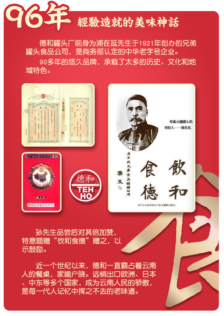 - 昆明德和罐头厂是中国最早开始生产制造罐头的企业之一,至今已有九十八年的悠久历史,现已形成以罐头食品为主,腌腊制品、糕点月饼等为辅的云南省规模最大和最具影响力综合食品制造企业,奠定了云南罐头行业的基石。