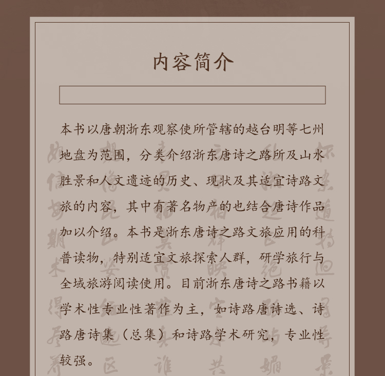 本书以唐朝浙东观察使所管辖的越台明等七州地盘为范围,分类介绍浙东唐诗之路所及山水胜景和人文遗迹的历史、现状及其适宜诗路文旅的内容,其中有著名物产的也结合唐诗作品加以介绍。本书是浙东唐诗之路文旅应用的科普读物,特别适宜文旅探索人群,研学旅行与全域旅游阅读使用。 目前浙东唐诗之路书籍以学术性专业性著作为主,如诗路唐诗选、诗路唐诗集(总集)和诗路学术研究,专业性较强。本书以学术研究为背景,重视学术研究成果与文旅应用相结合,专业性与应用性相结合,唐诗文化与文旅趣味相结合,图文并茂,增添了阅读快乐和文旅向导功能。