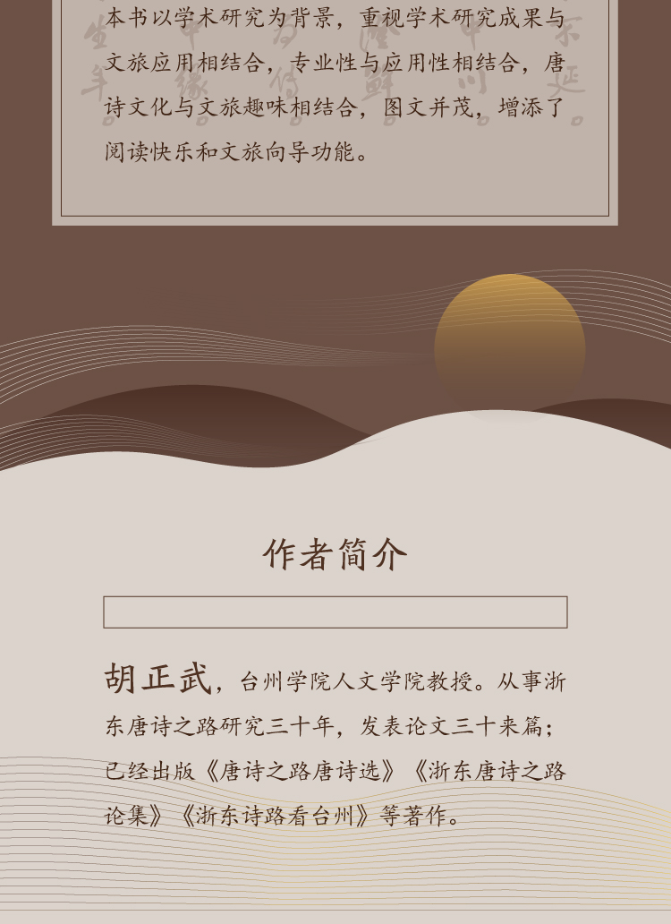胡正武,台州学院人文学院教授。从事浙东唐诗之路研究三十年,发表论文三十来篇;已经出版《唐诗之路唐诗选》《浙东唐诗之路论集》《浙东诗路看台州》等著作。