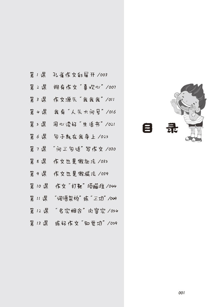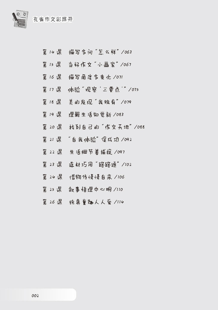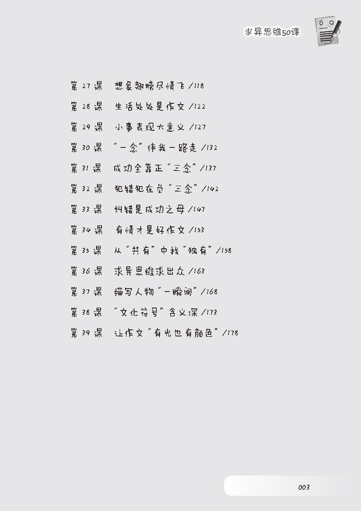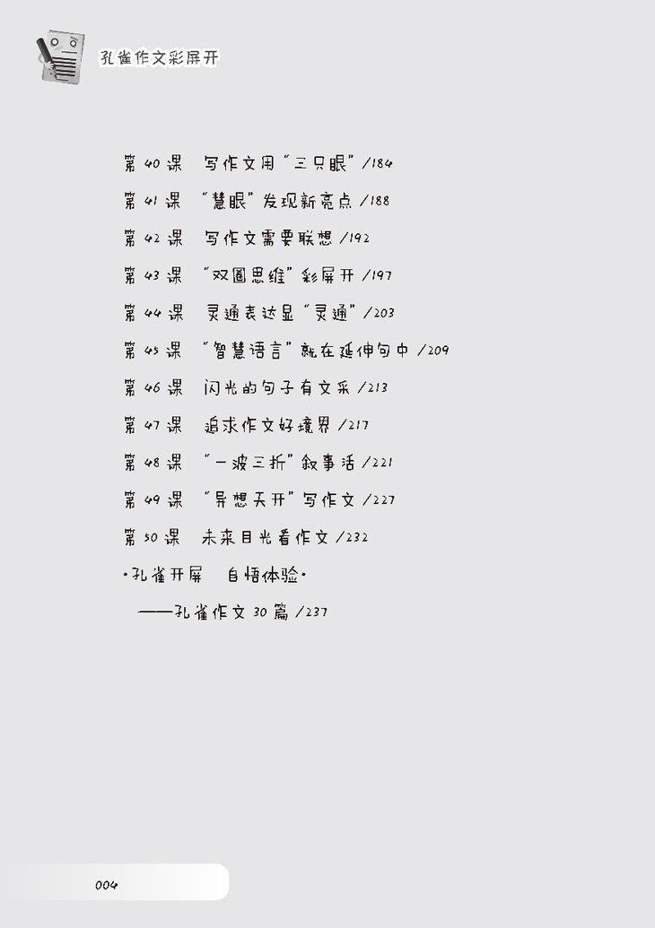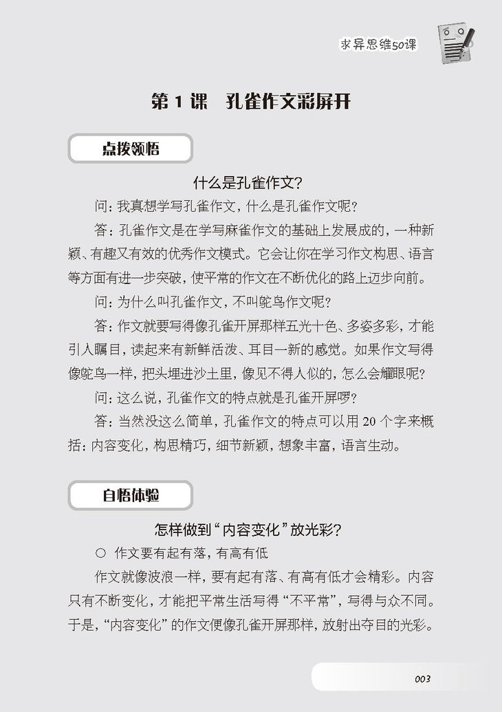 《小学生作文求异思维50课——孔雀作文彩屏开》每课由5小部分组成: