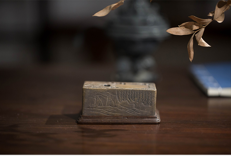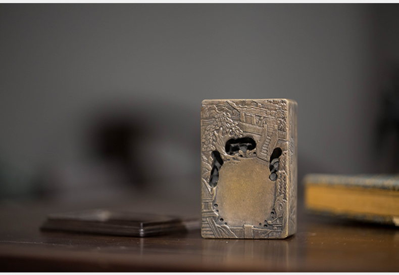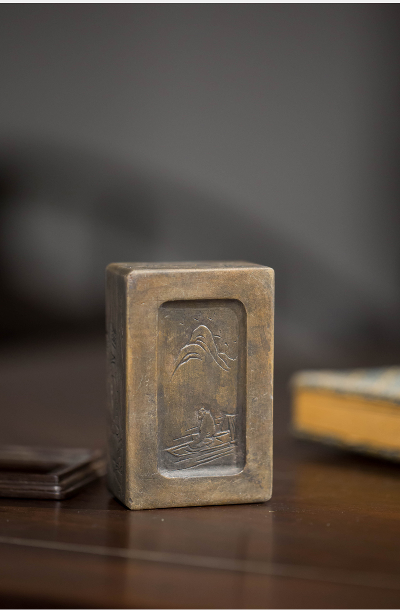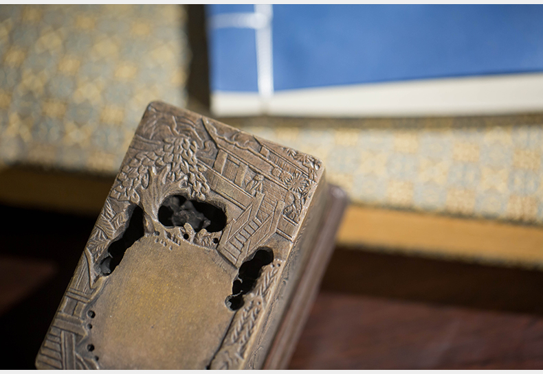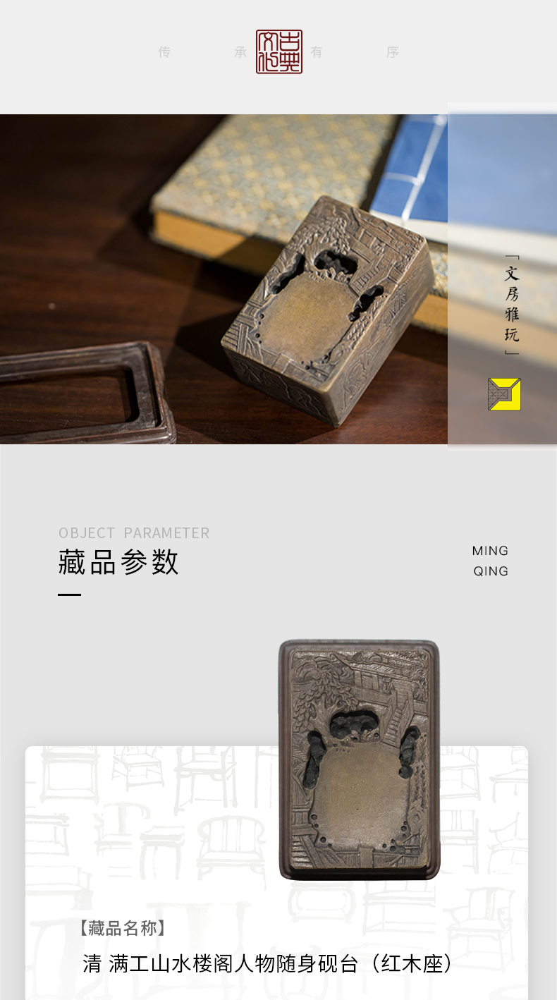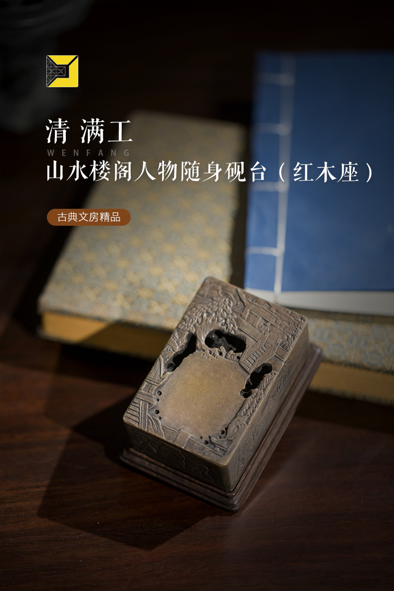 清代 满工山水楼阁人物随身砚台(红木座)