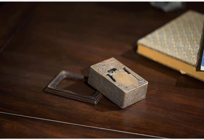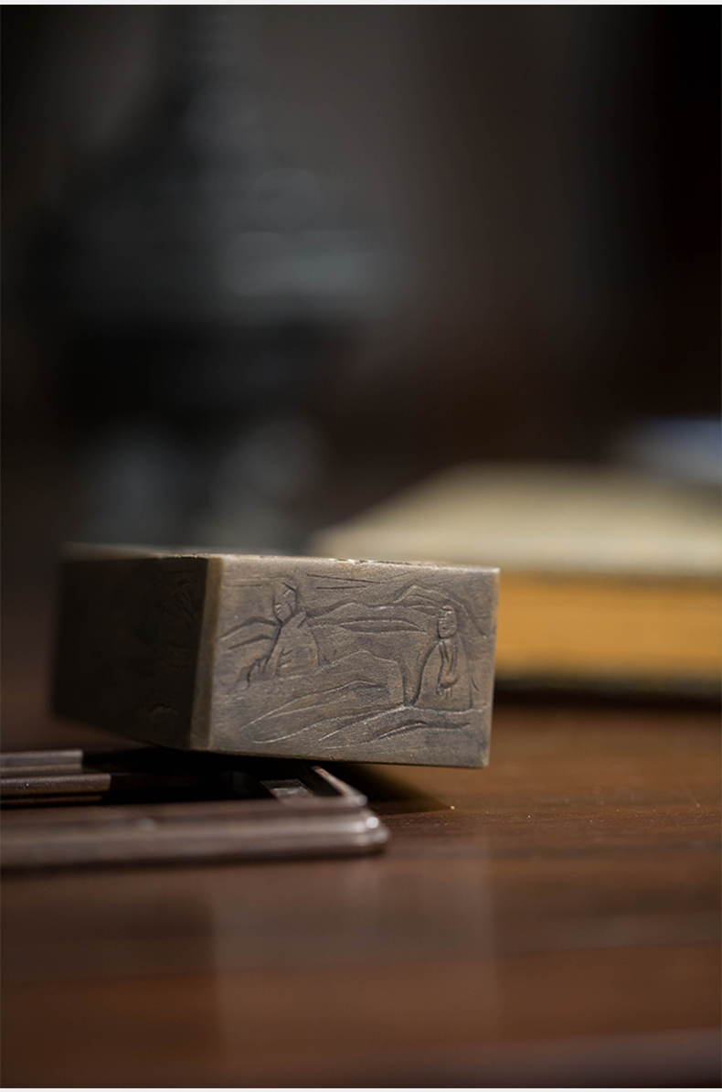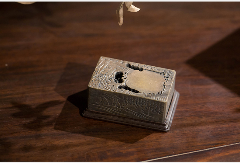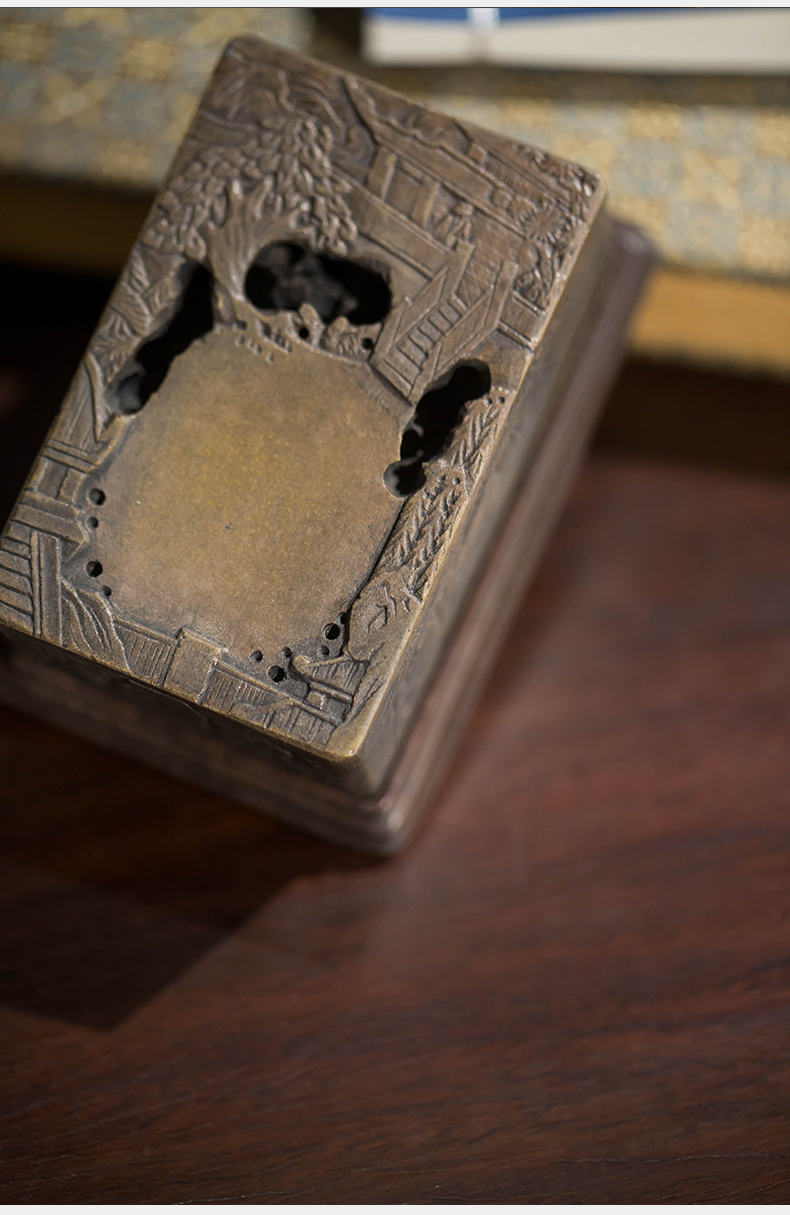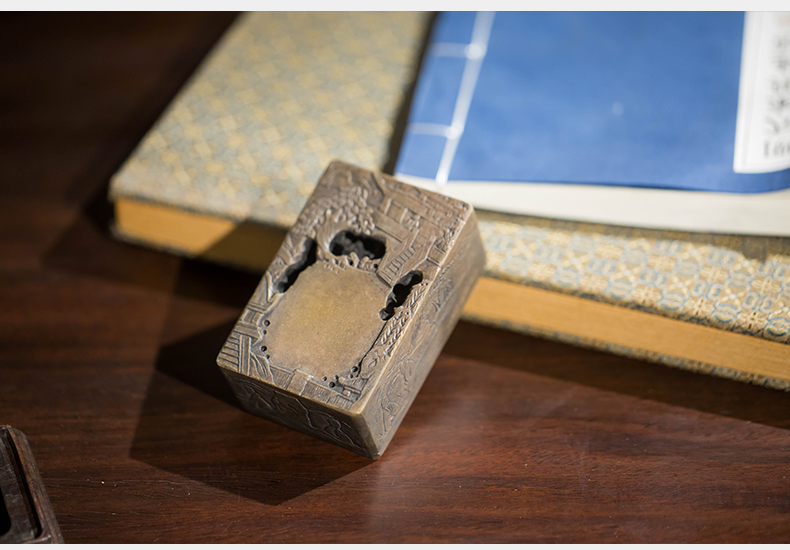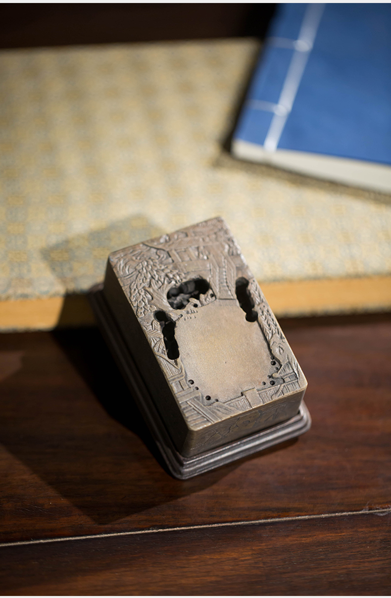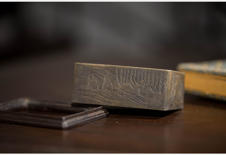 清代 满工山水楼阁人物随身砚台(红木座)