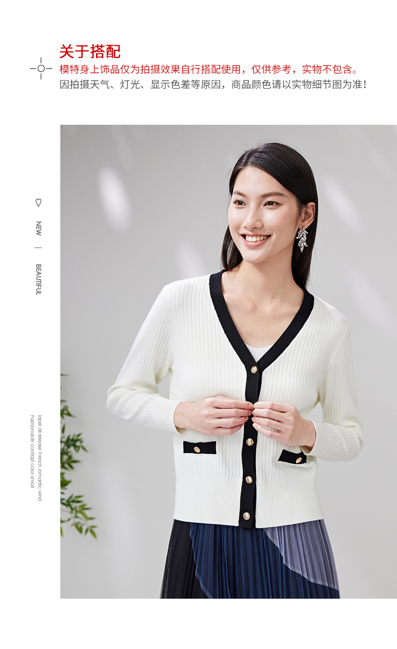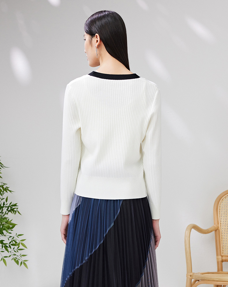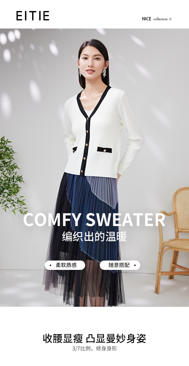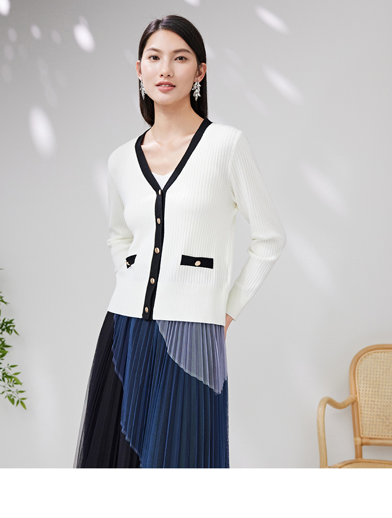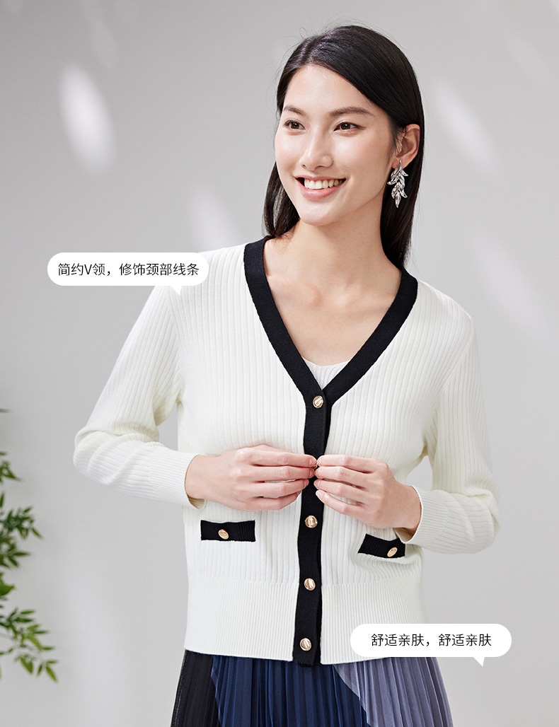 EITIE爱特爱春季新款撞色简约显瘦通勤百搭白色V领针织开衫A2301101