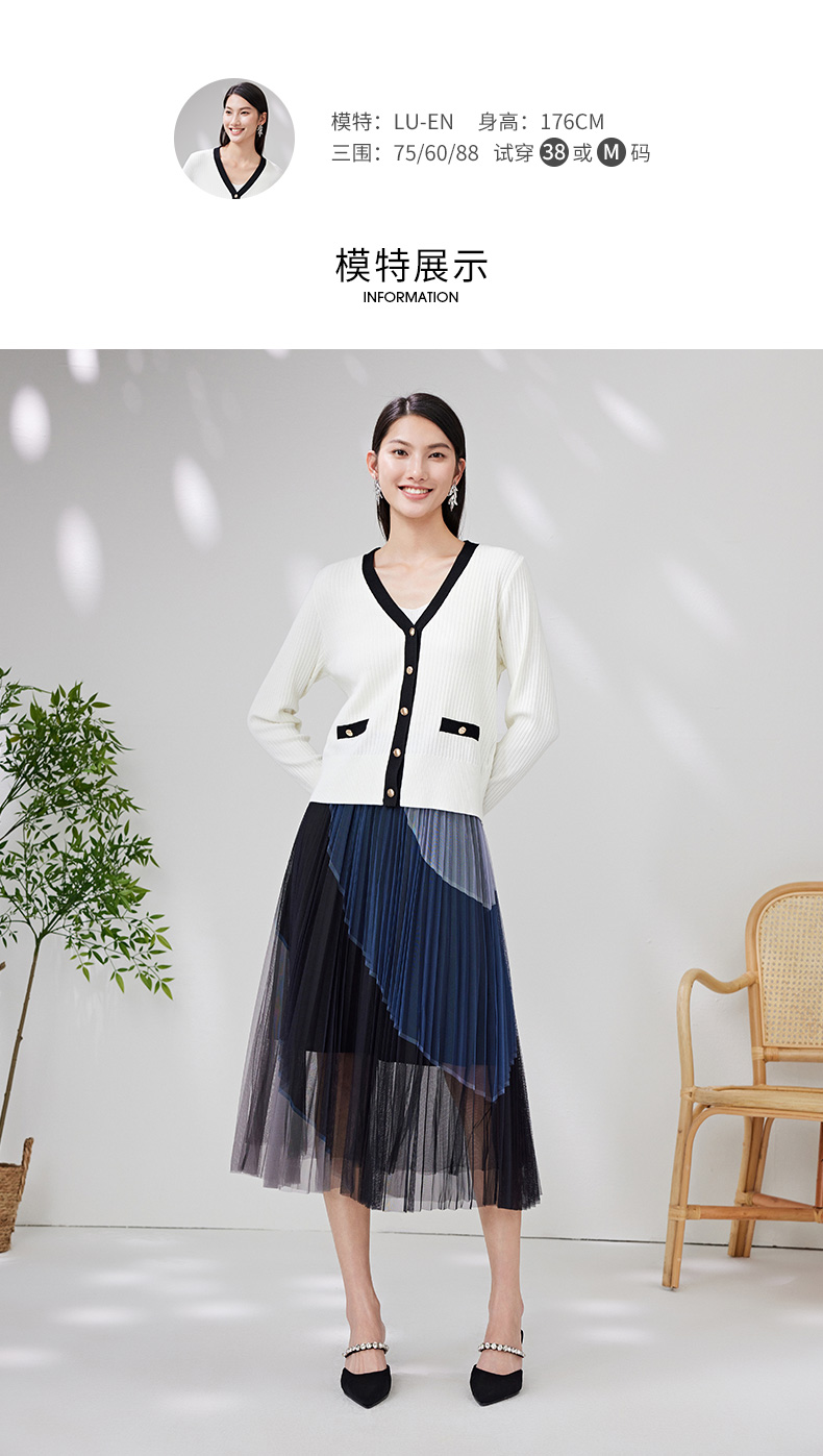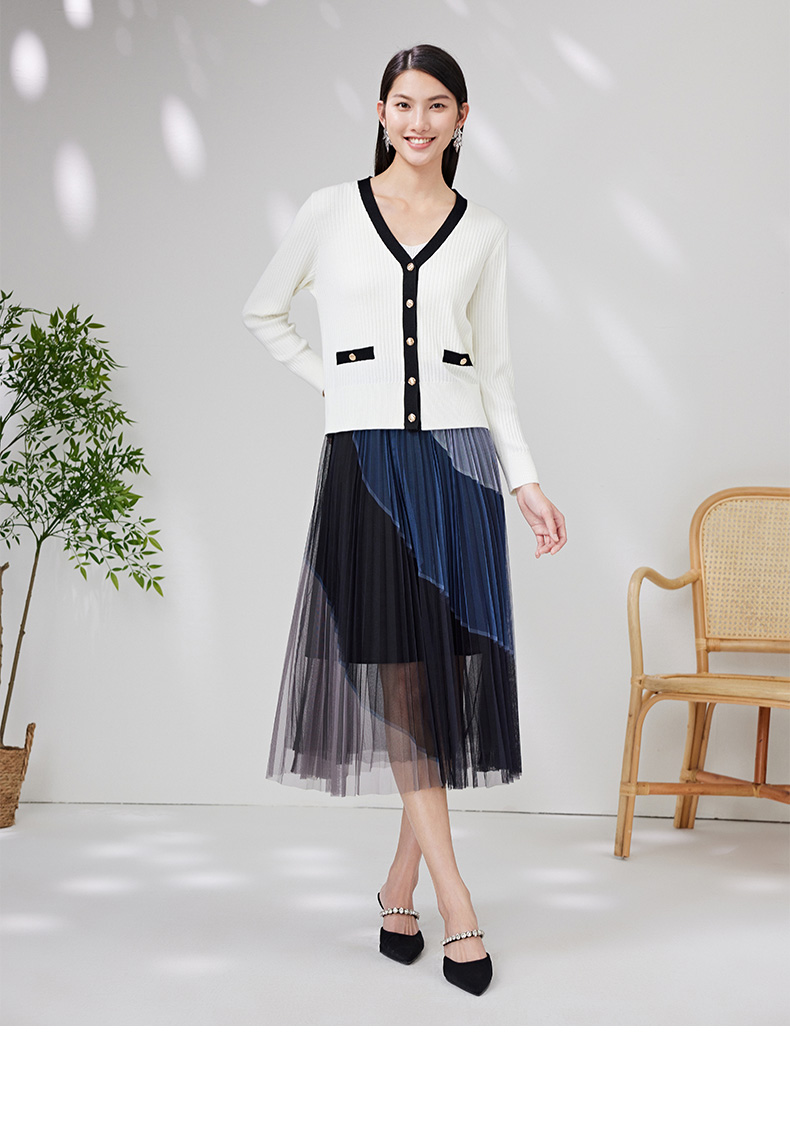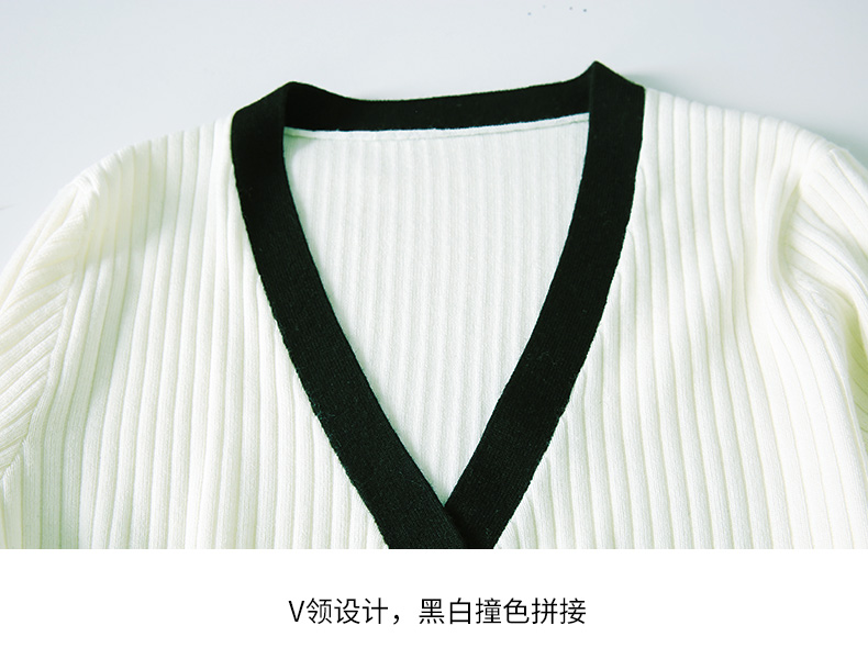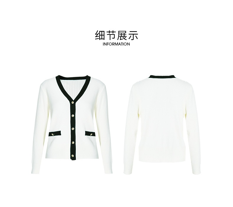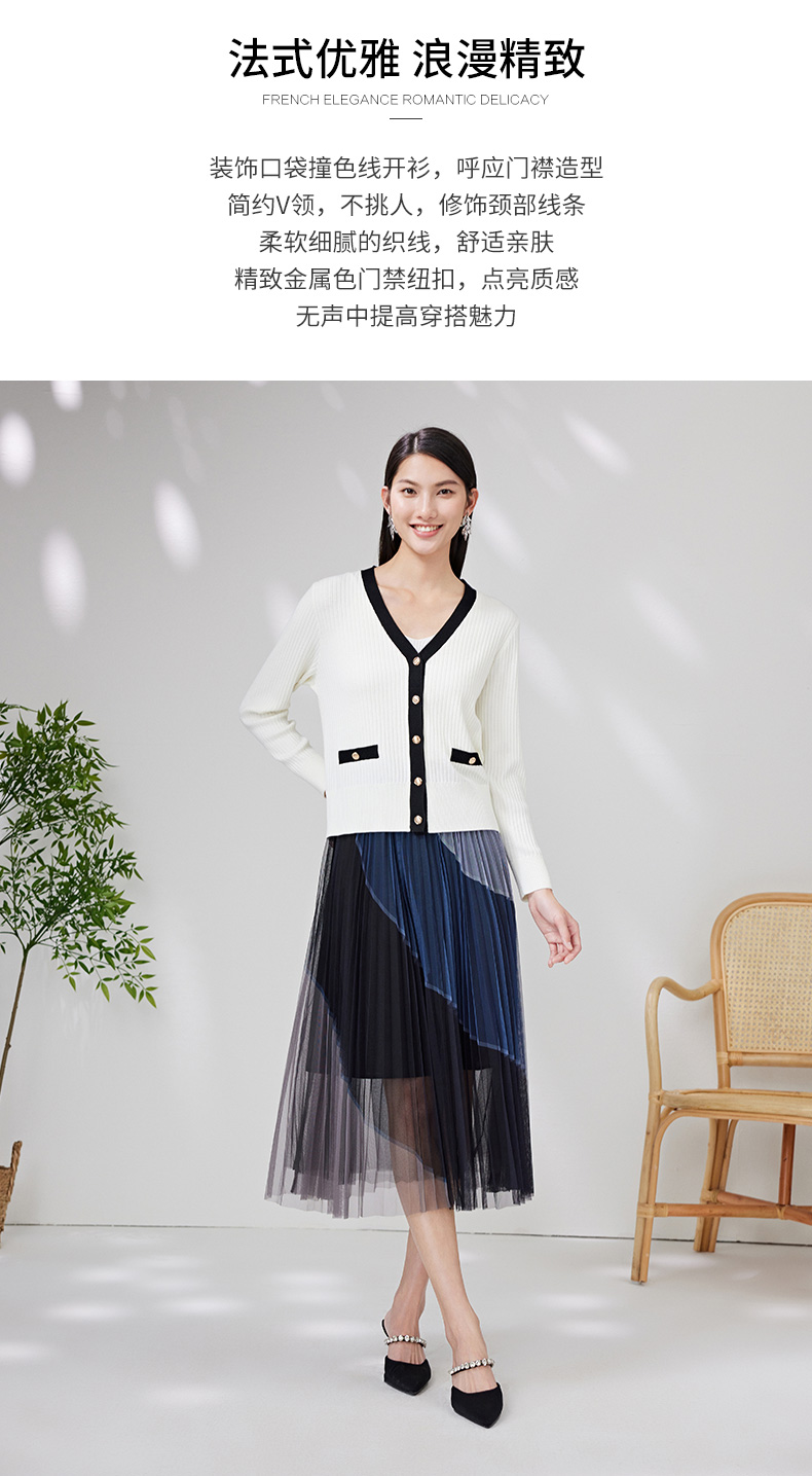 EITIE爱特爱春季新款撞色简约显瘦通勤百搭白色V领针织开衫A2301101