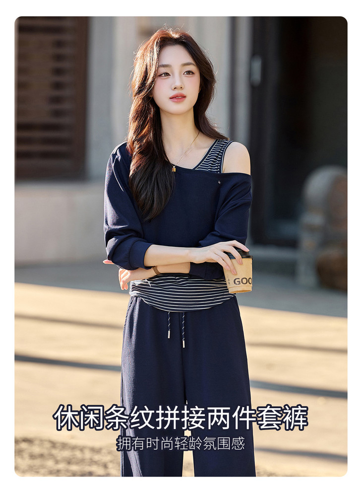 2025秋季新款拼接设计感条纹假两件卫衣阔腿裤两件套LT2675 商品图0
