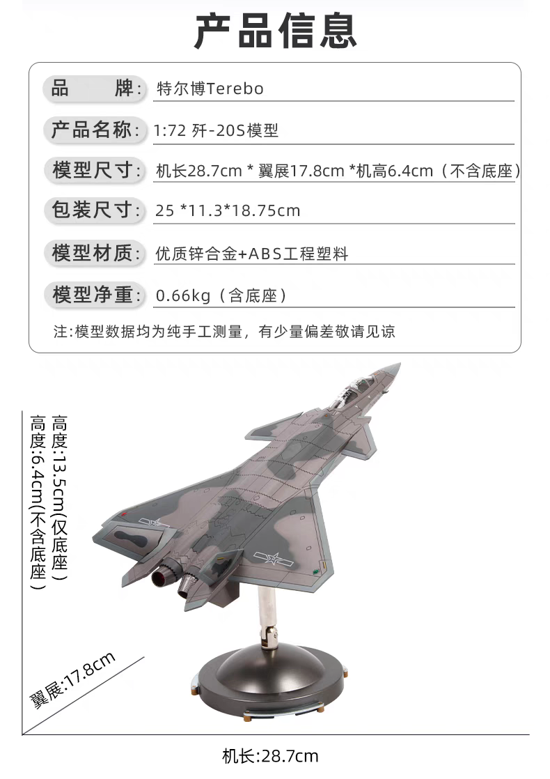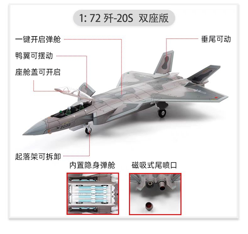 【合金仿真 中航2.0升级版】特尔博1:48歼20隐形战斗机飞机模型