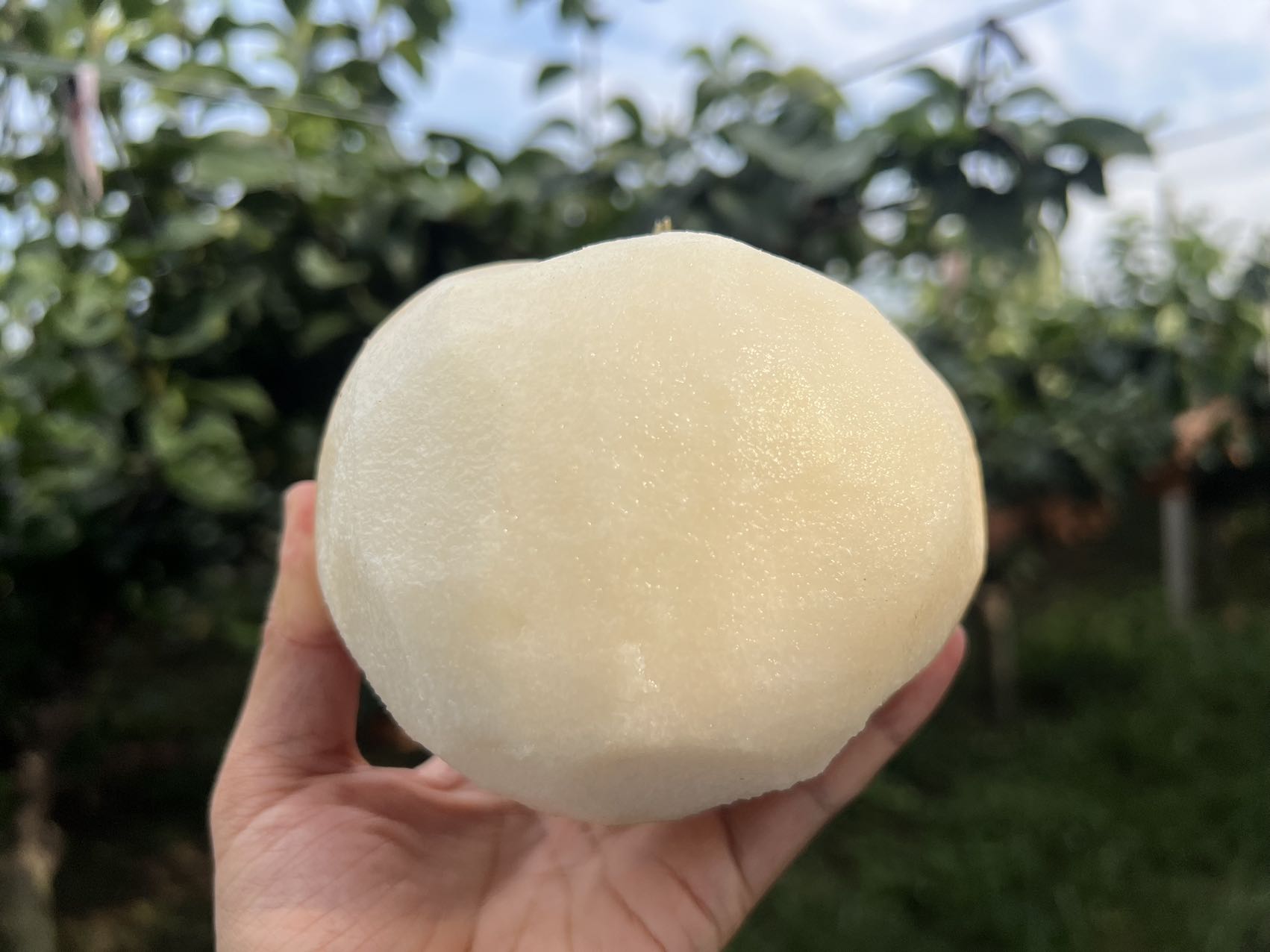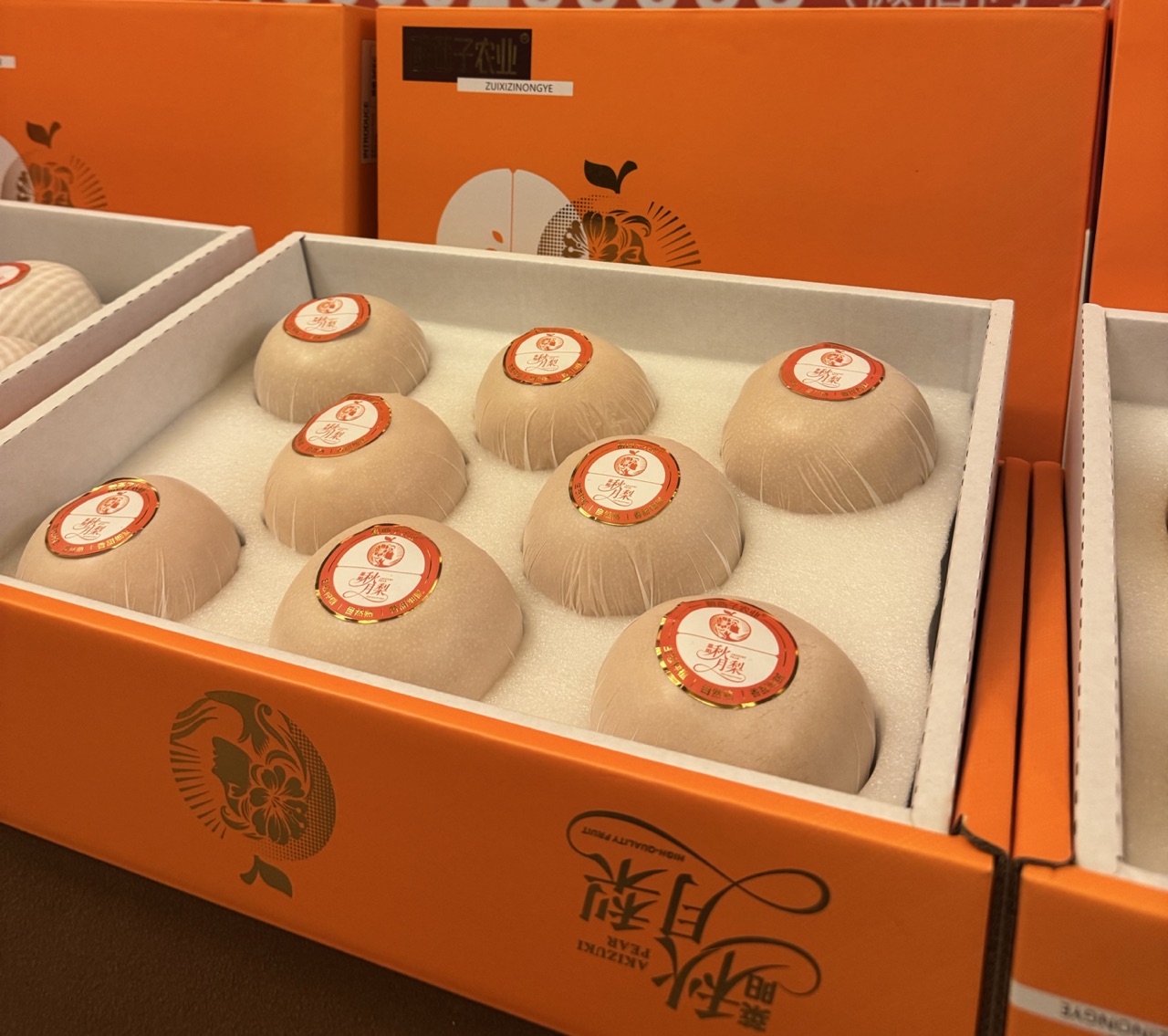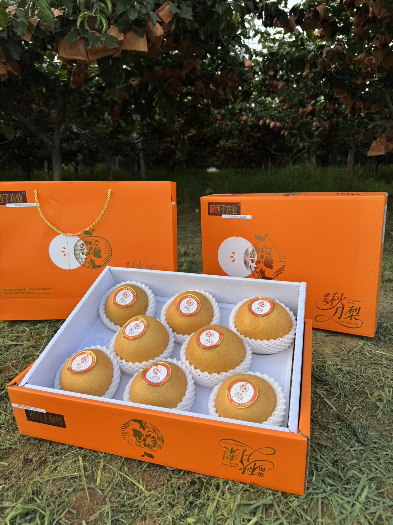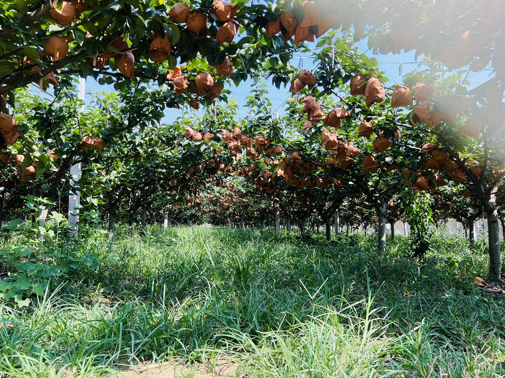 一个个梨子被淡黄色的牛皮纸包裹着营造无菌、防虫、健康的生长环境,虽然费时费力,但隔绝了虫害,果形更优美,受到保护的梨子个头会更大,更甜、更水润!