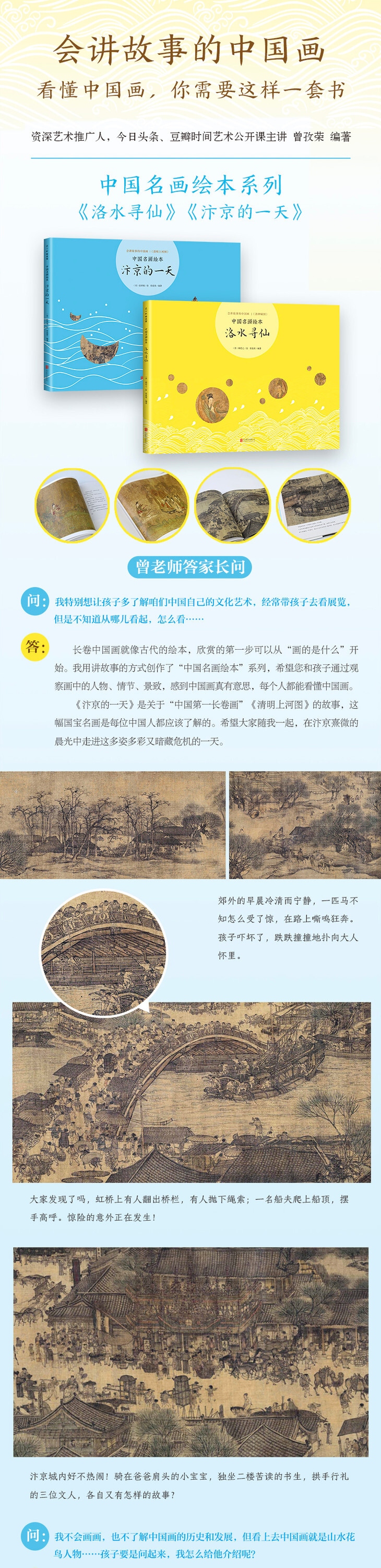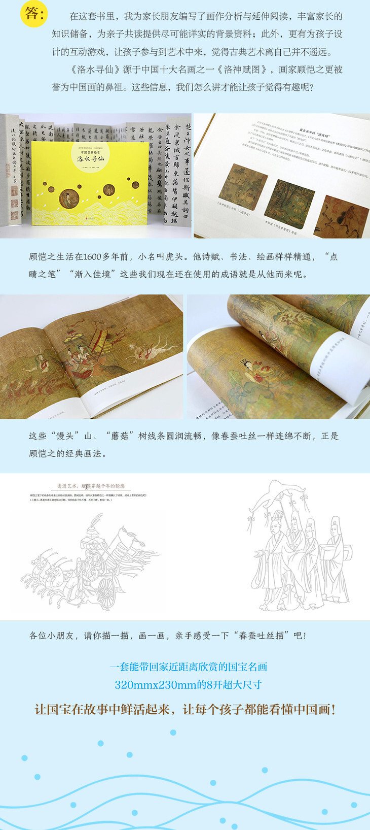 故事后的知识介绍能让孩子对中国画有更多了解:洛神手持的羽扇中藏了什么秘密?画中的红日、蜡烛、衣装有什么特殊含义?顾恺之在《洛神赋图》中首创了哪些中国画经典样式?