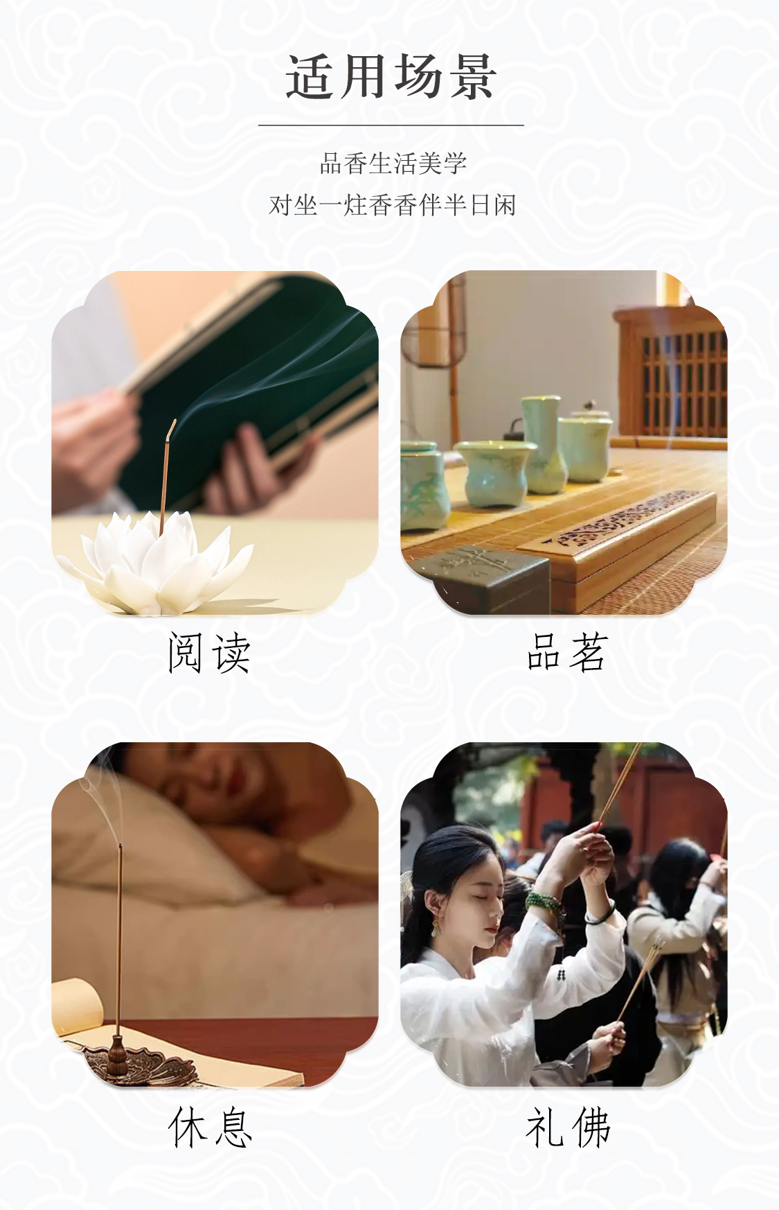 【适用场景】缓解压力,凝神静心,芳香助眠,尤适合品茶、读书、打坐、瑜伽、静心。