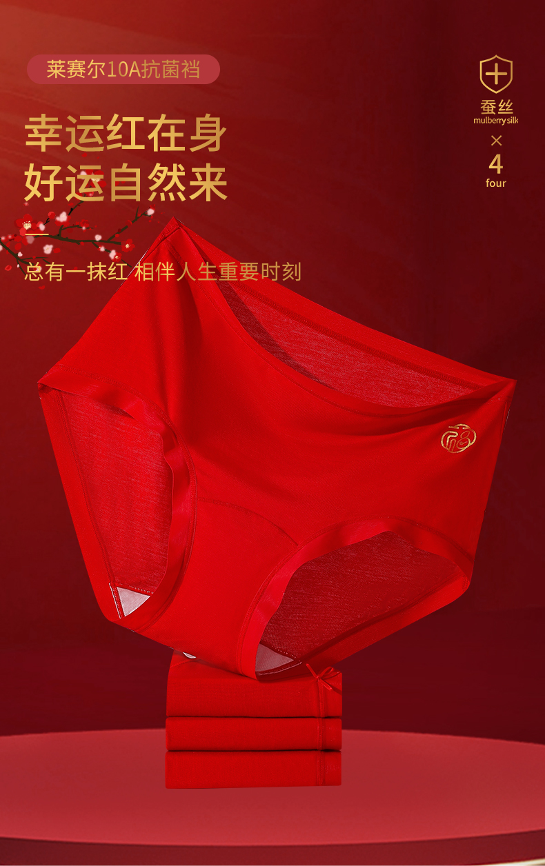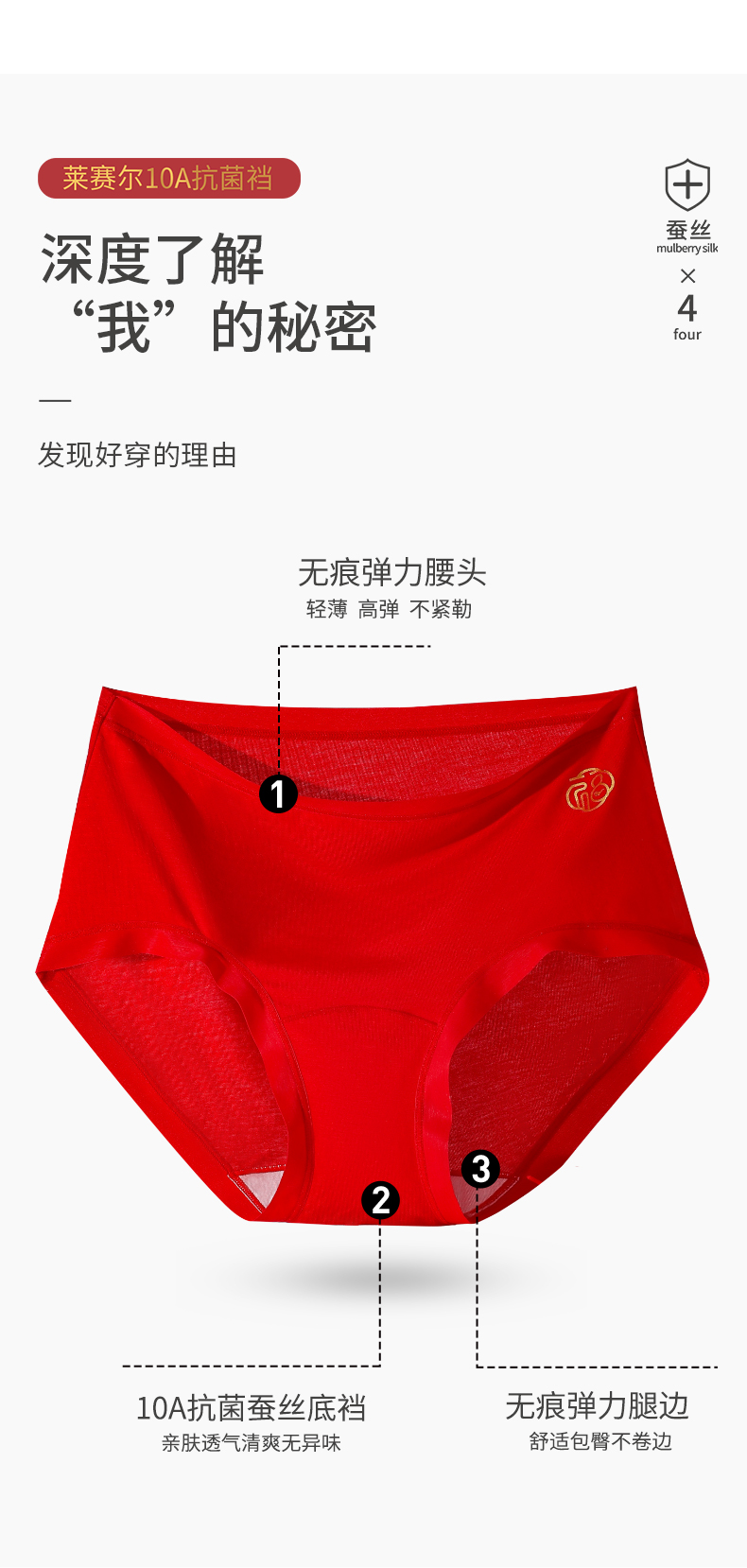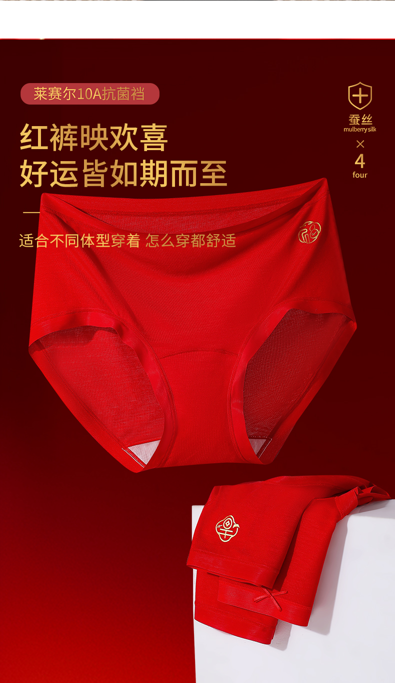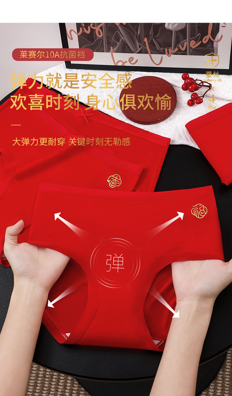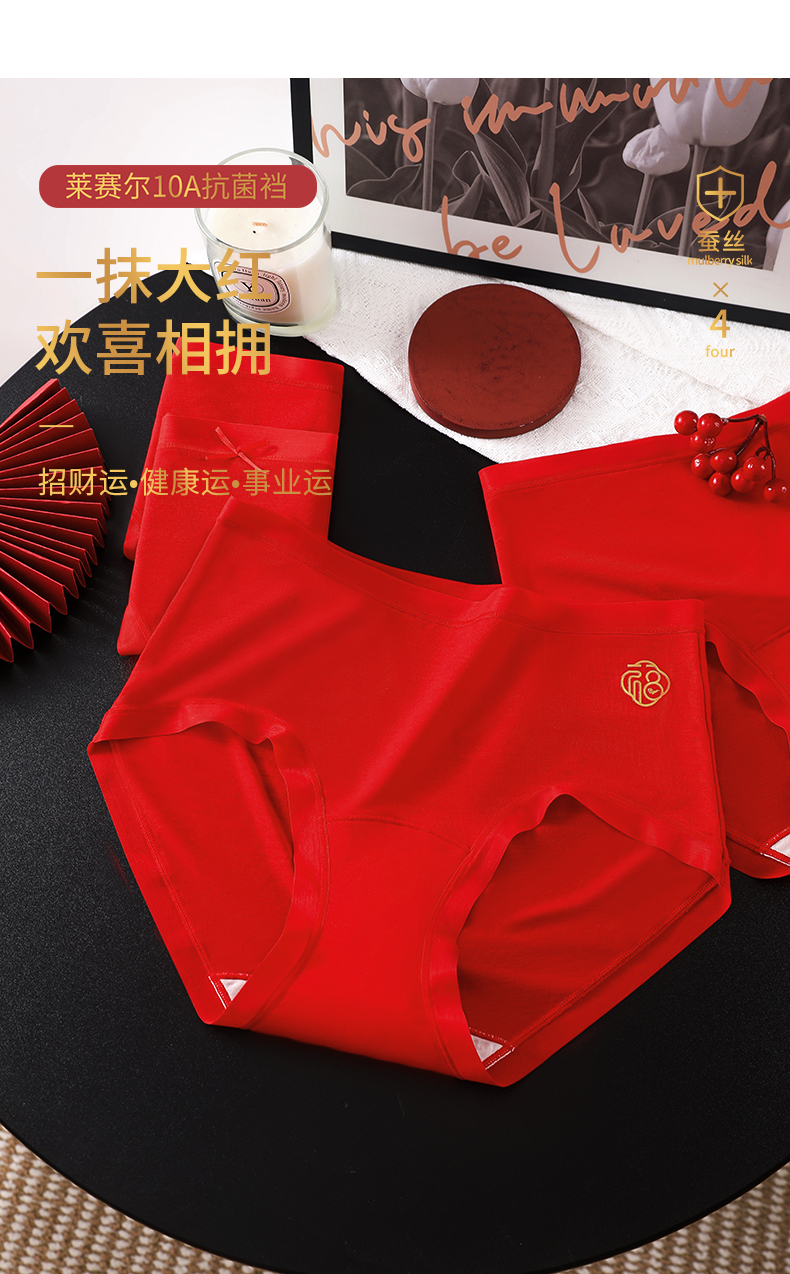樱姿娜新年红内裤,女款80041欢喜裤,4条礼盒装,莱赛尔幸运红,蚕丝底裆,舒适透气