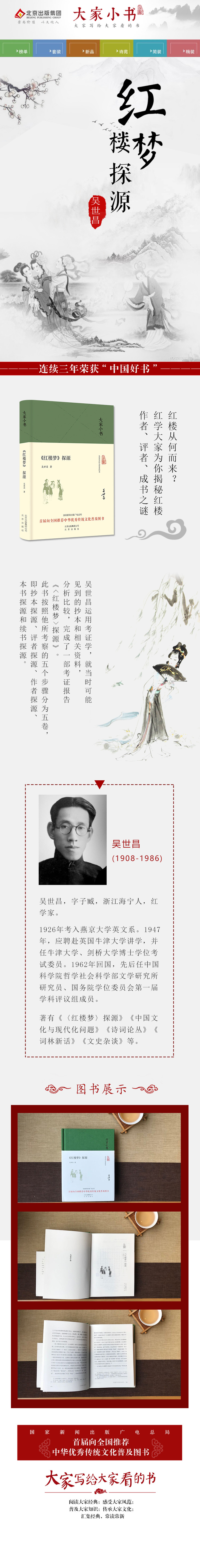 吴世昌对《红楼梦》的考证,开始于这个批判运动奏凯之后。他以讲学之暇,穷数年之功,运用他精通的考证学而不是他所不熟悉的主义,就当时可能见到的抄本和相关资料,爬罗剔抉,分析比较,完成了一部考证报告《<红楼梦>探源》(后简称《探源》)。此书按照他所考察的五个步骤分为五卷,即抄本探源、评者探源、作者探源、本书探源和续书探源。书以英文写成,1961年由牛津大学出版社出版。《探源》的中文版,先生生前翻译了一半,未竞的部分是補譯者受命补译的,在20世纪90年代末面世。讀者现在看到的这本书,是《探源》的节本,略去了基础性研究(对抄本、评语的对比分析)部分,直接进入对评者、作者、全书故事结构的考察。