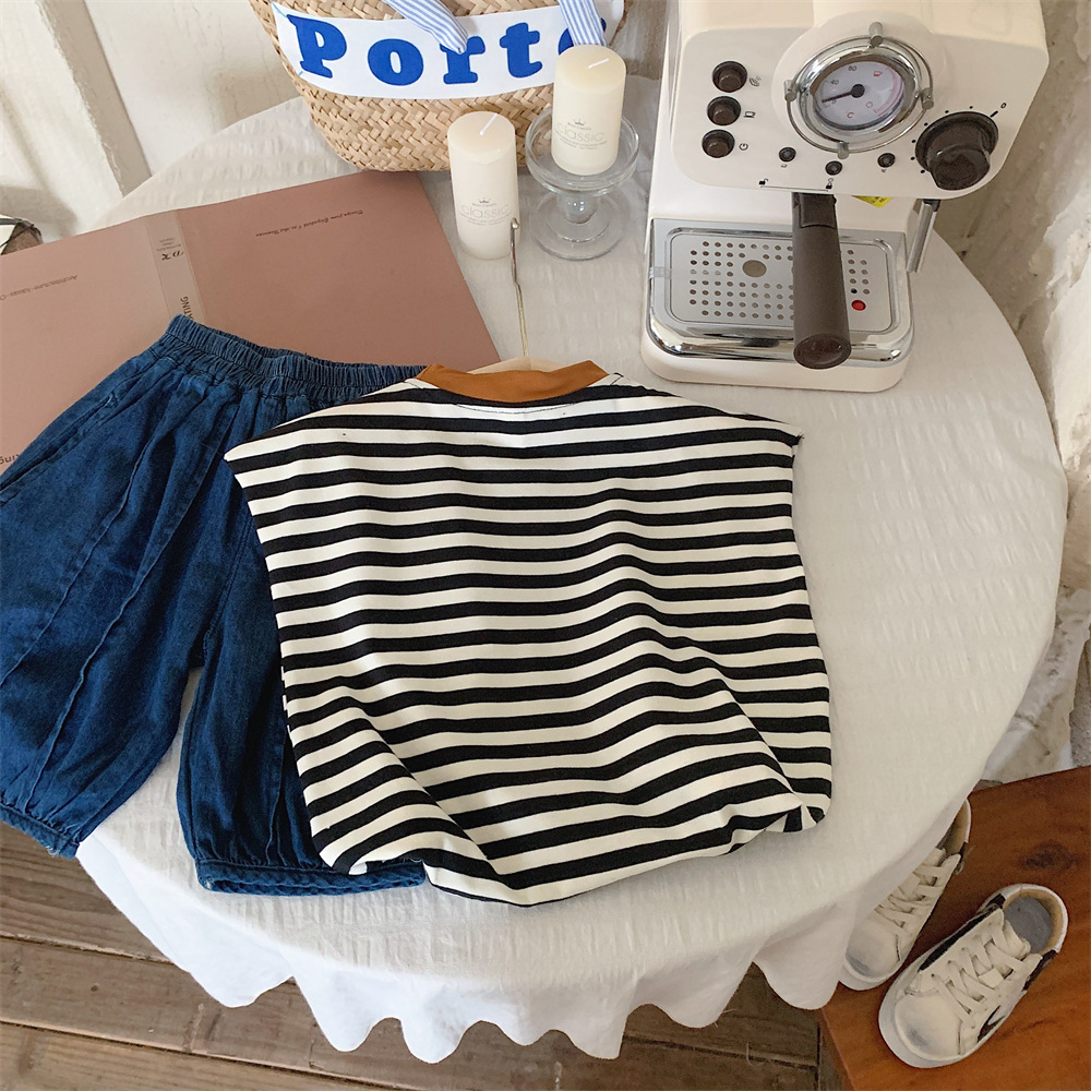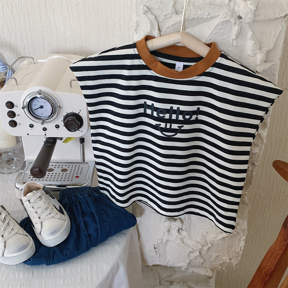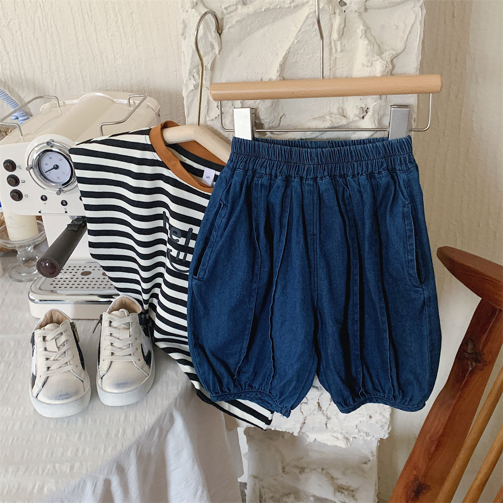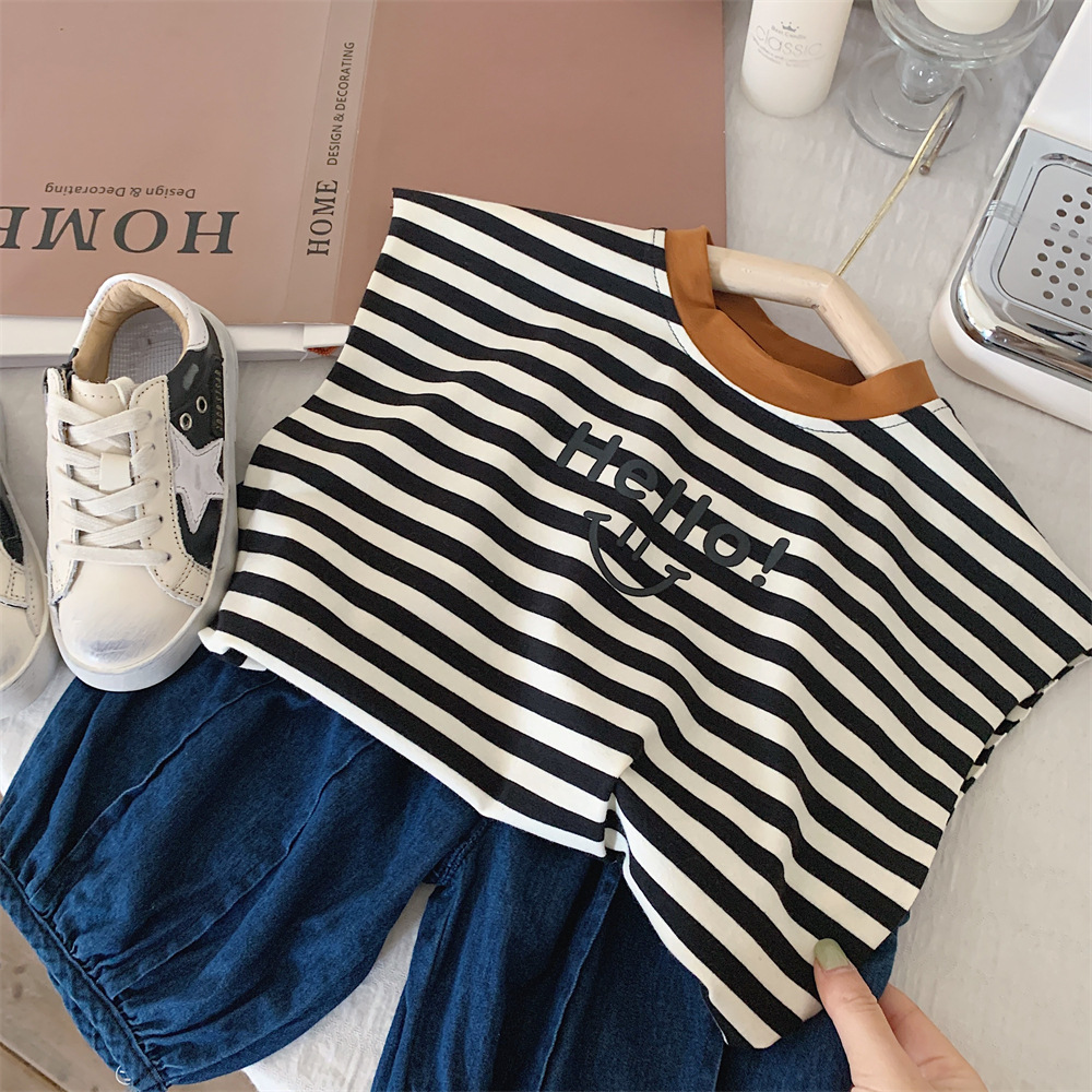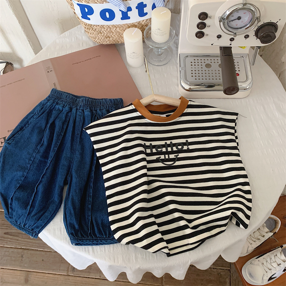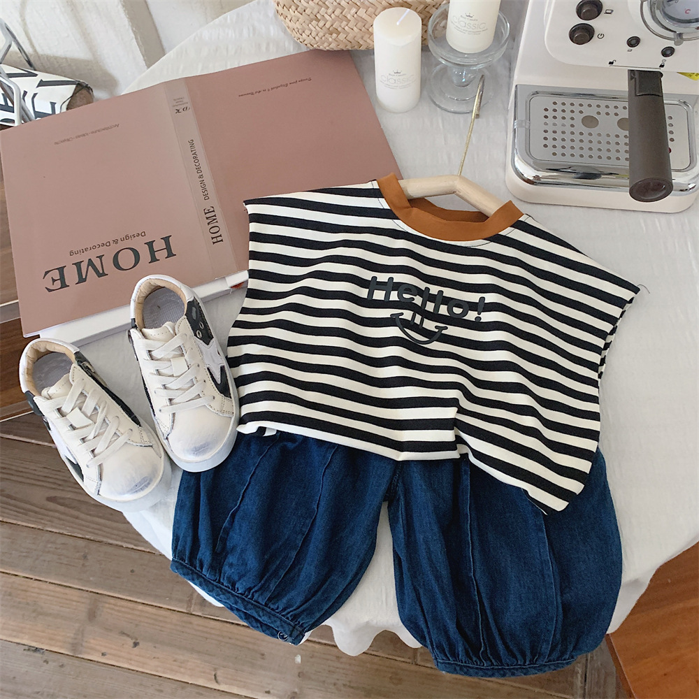 【冰丝凉爽透气,松紧裤腰带】2023夏季新款冰丝牛仔童装,圆领条纹设计凉爽透气不起球,儿童韩版冰瓷棉无袖套装男童痞帅一套-SH