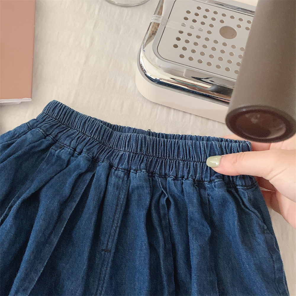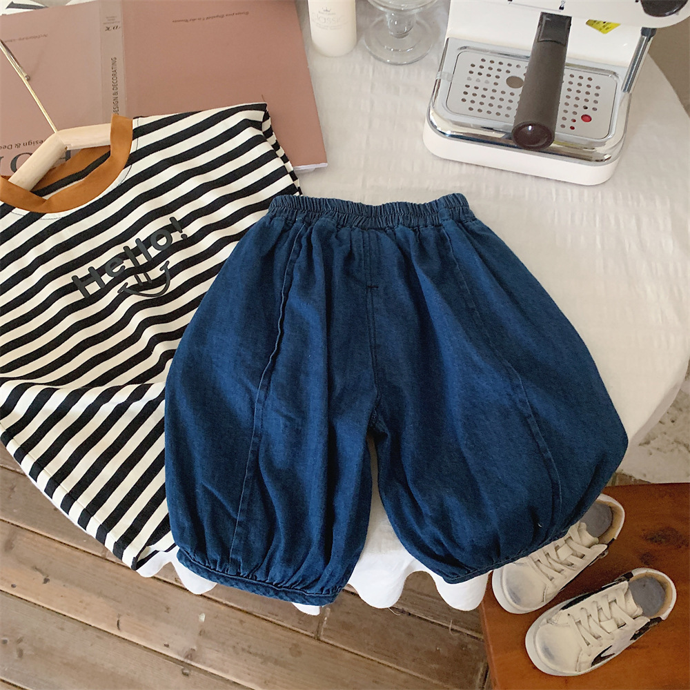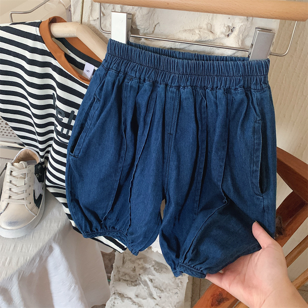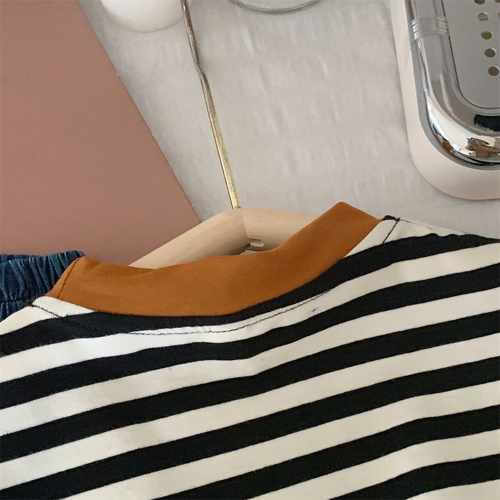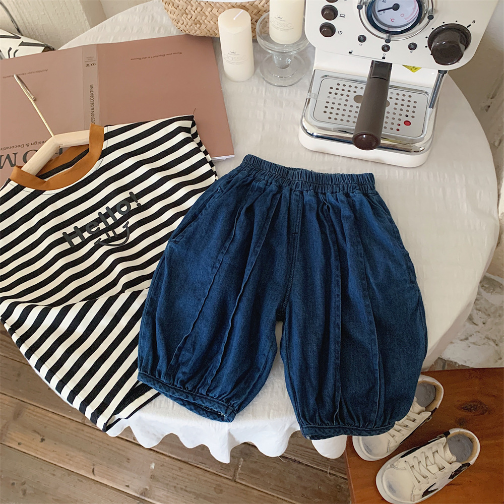 【冰丝凉爽透气,松紧裤腰带】2023夏季新款冰丝牛仔童装,圆领条纹设计凉爽透气不起球,儿童韩版冰瓷棉无袖套装男童痞帅一套-SH