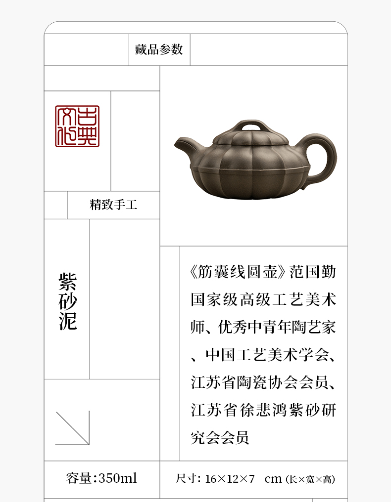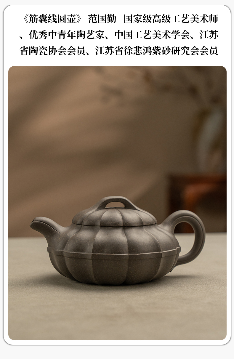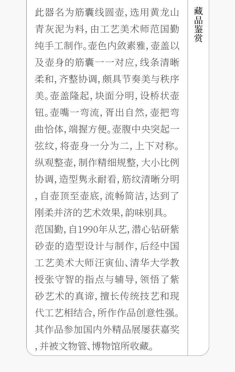 《筋囊线圆壶》 范国勤 高级工艺美术师、优秀中青年陶艺家、中国工艺美术学会、江苏省陶瓷协会会员、江苏省徐悲鸿紫砂研究会会员