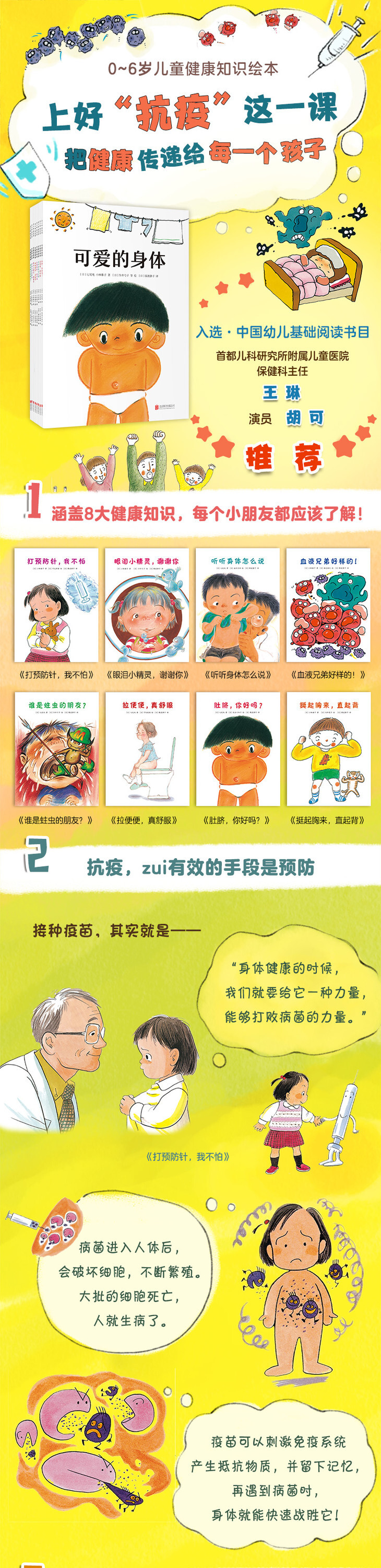 1、肚脐是孩子和妈妈亲情联结的独特纪念,孩子应该知道,和小小的肚脐一样,身体的任何部位都很珍贵;哭泣是释放情绪的一种重要方式,要允许孩子适时宣泄,学会表达;害怕打针并不意味着不勇敢,只是孩子出于对未知的焦虑……这套书用孩子的语言讲解科学知识,还融入了妈妈般的温柔、细致,不仅为孩子开启了“健康启蒙the first 课”,还传递出富有人文关怀的健康理念。如果让我只选一套身体认知绘本,那非《可爱的身体》莫属。