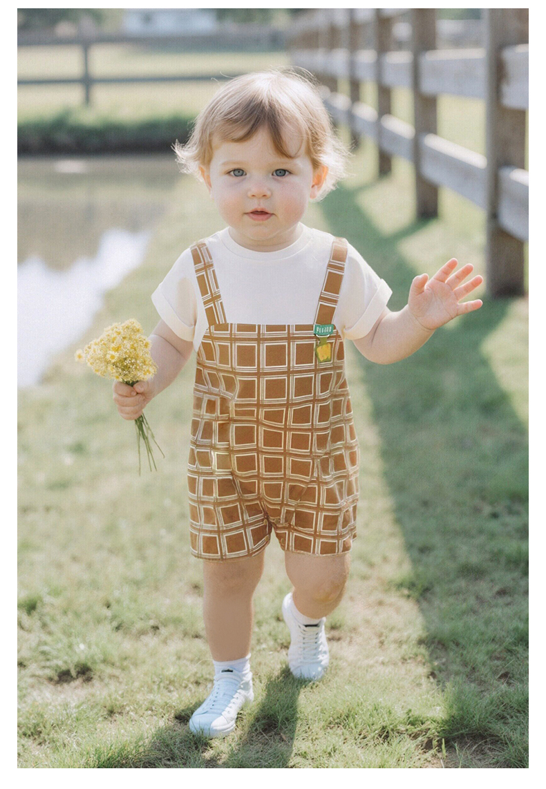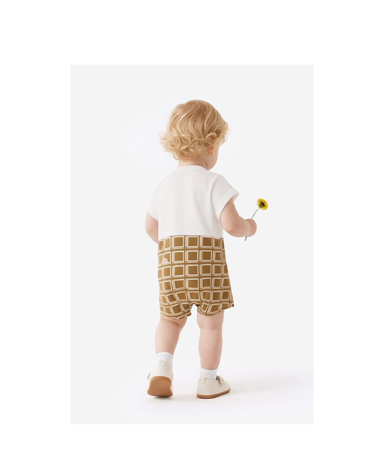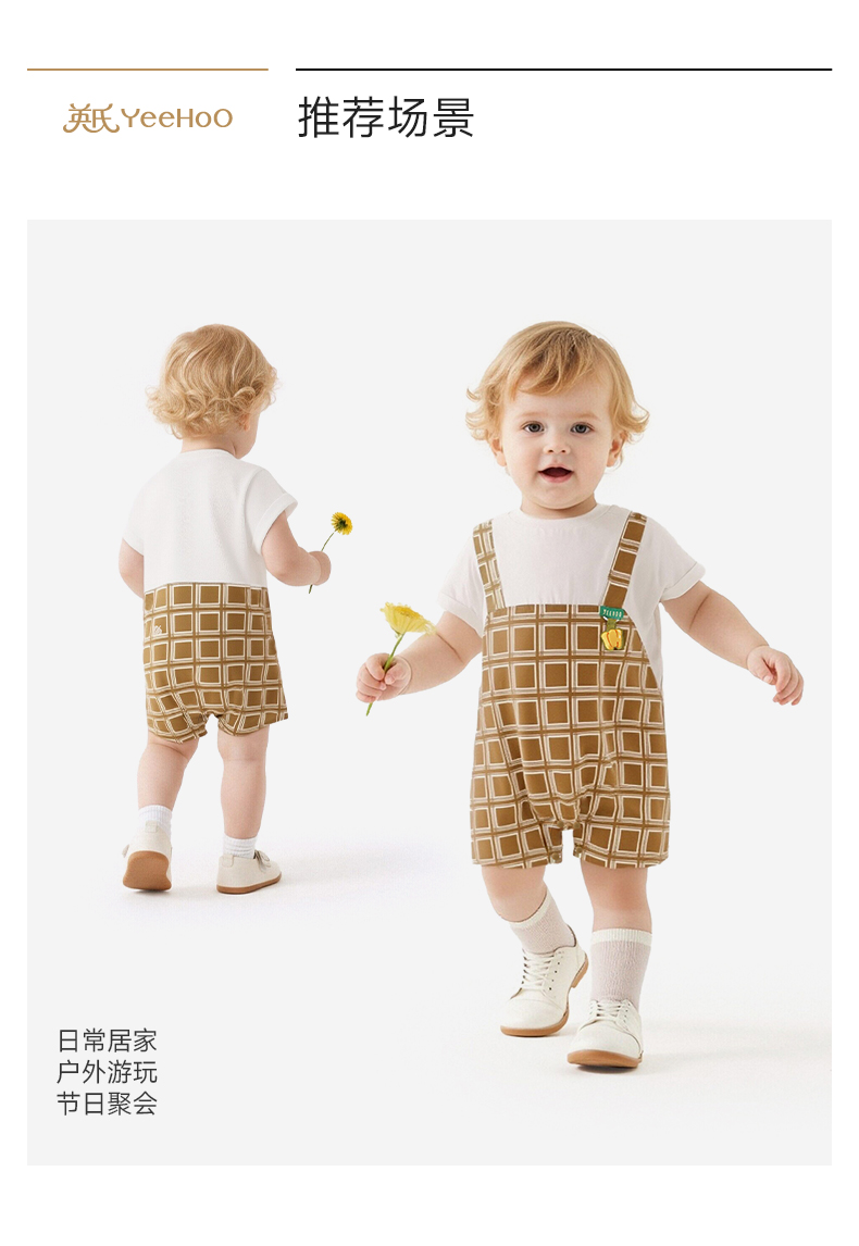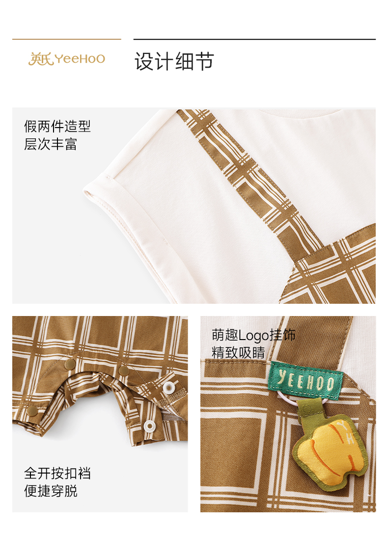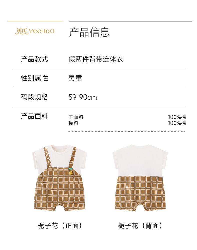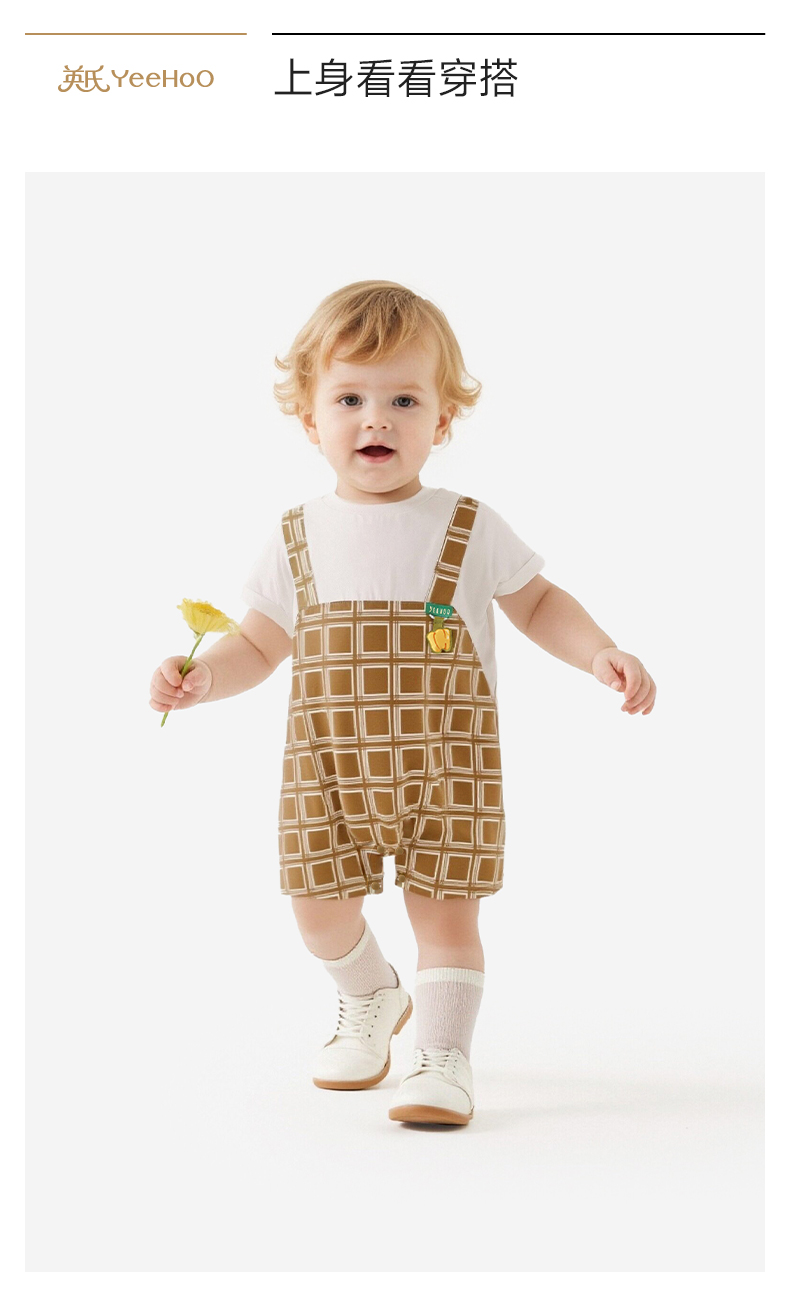 【商场同款】英氏婴儿衣服男童夏季短袖假两件格子连体衣纯棉哈衣