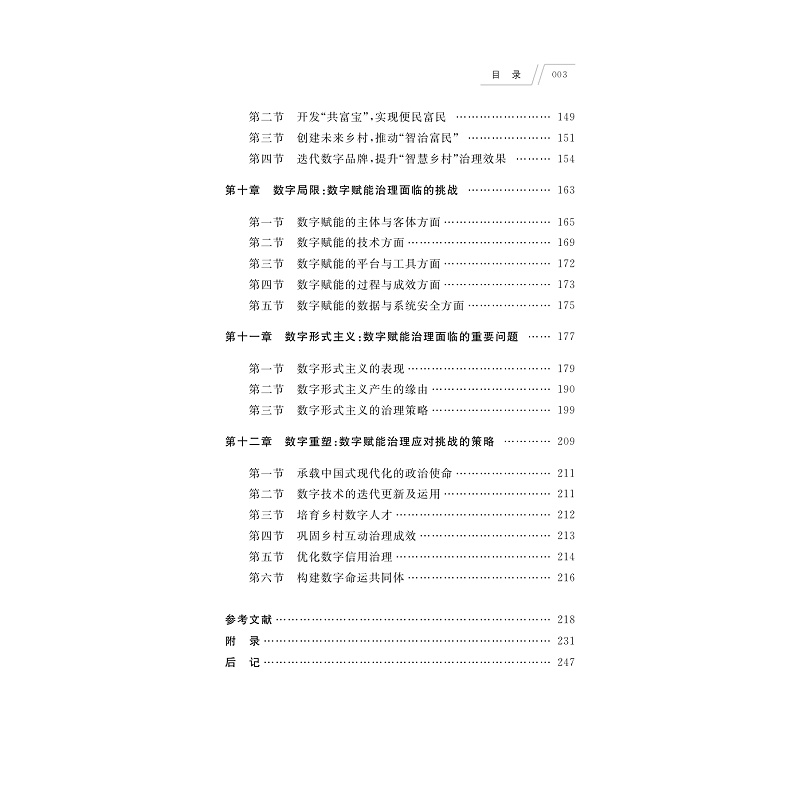 本书以浙江省杭州萧山区戴村镇“映山红”数字乡村治理计划为案例,分析探讨了数字赋能乡村治理相关理论与实践问题。研究指出:赋能理论是数字赋能治理的基本依据,困境和需求往往是数字赋能治理的主要原由,数字软件和硬件建设是数字赋能治理的重要基础,系统性地赋能是数字赋能治理的常用方法,推动互动治理是数字赋能的根基,加强数字党建是数字赋能的重点,导入数字信用是数字赋能的杠杆,推进数字迭代有利于数字赋能治理的升级,等等。