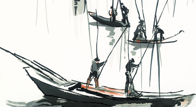 湖上飘来群群罱河泥的小船,墨点在浮游;篙杆如林,如林的尖锐直线刺破了镜面,要充分发挥直线之锋芒,因为直线就是这台戏的主角。