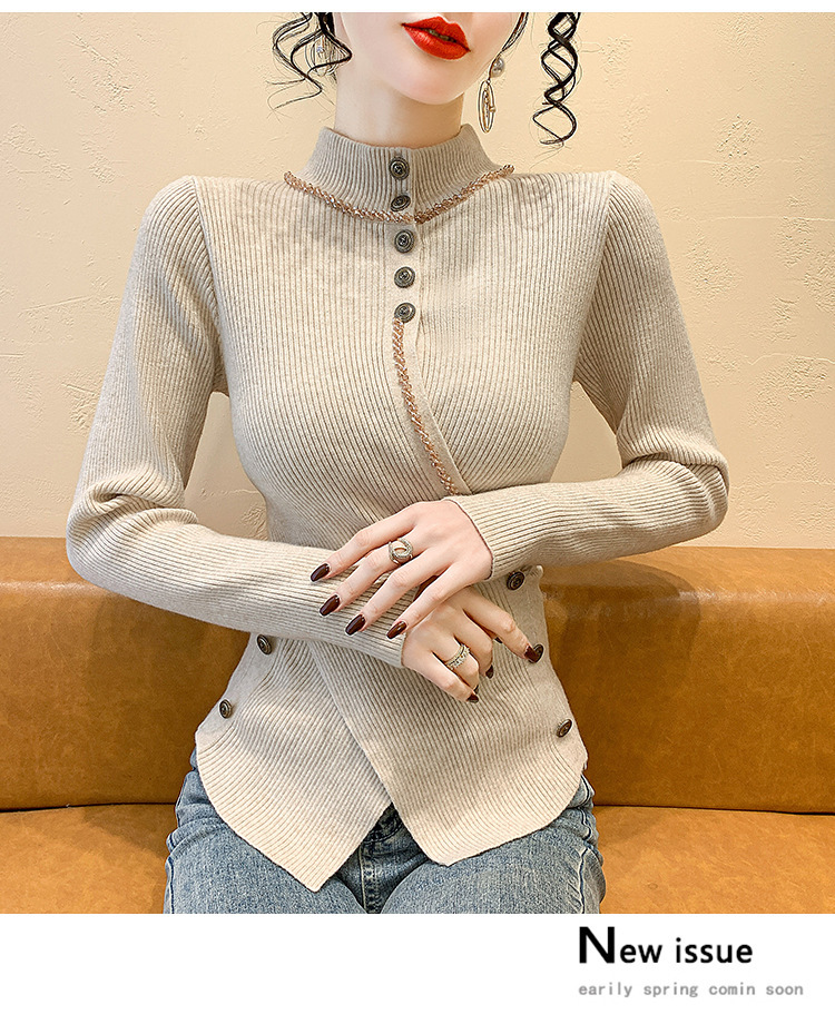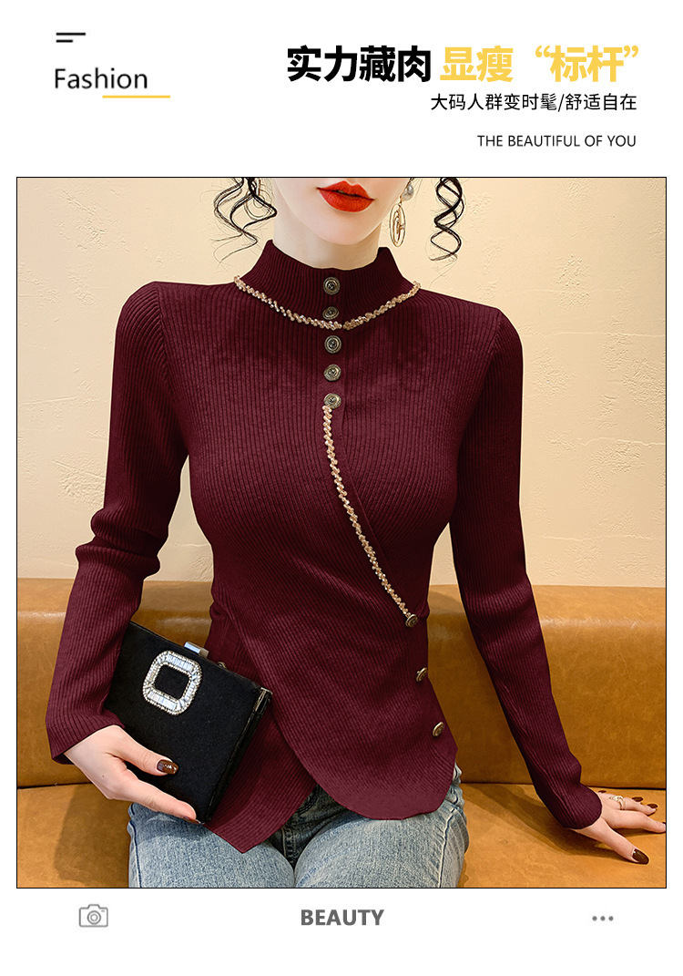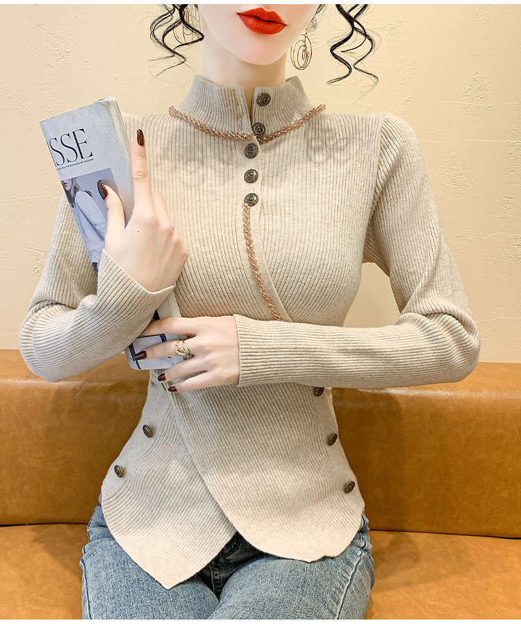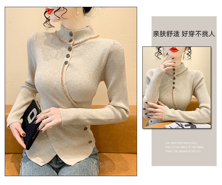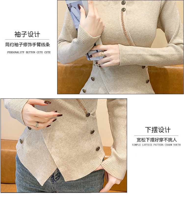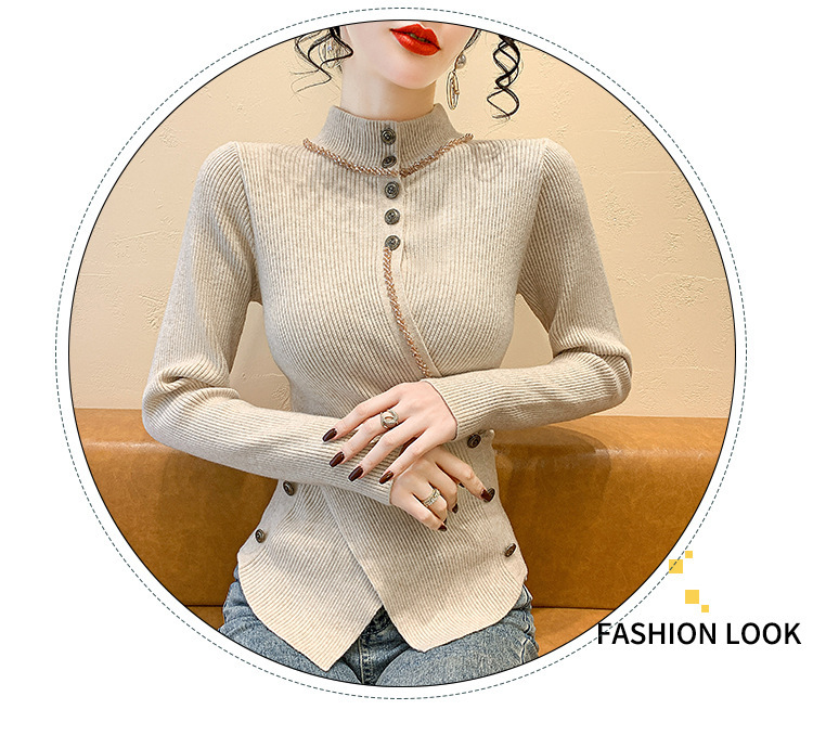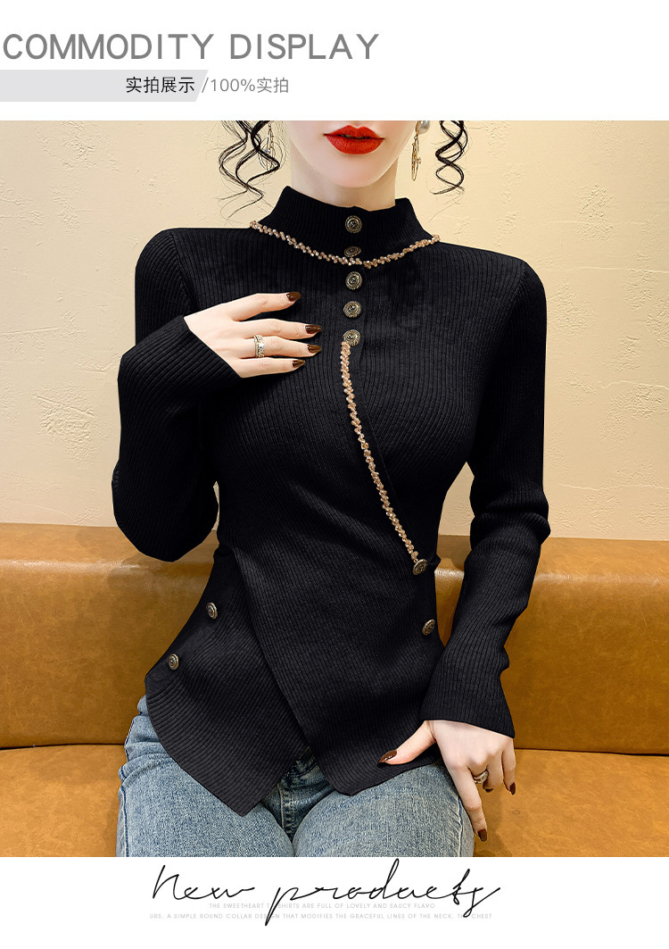 KQL-C410N小香风半高领纽扣开叉毛衣女2024冬季新款别致小众气质针织上衣潮