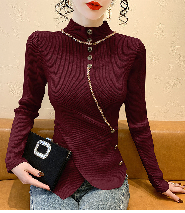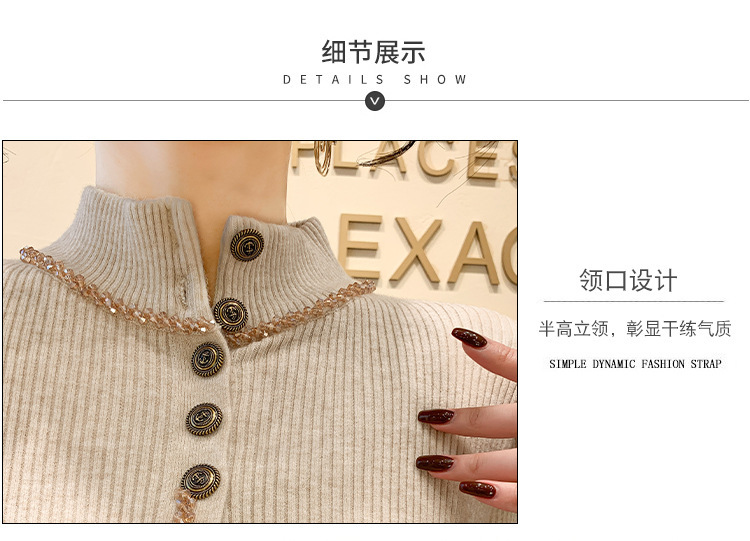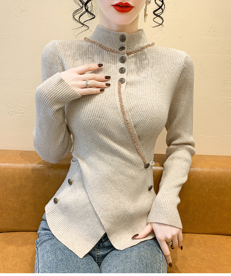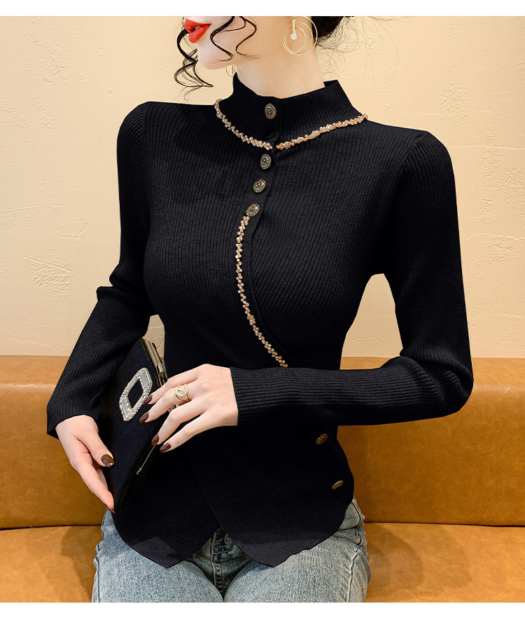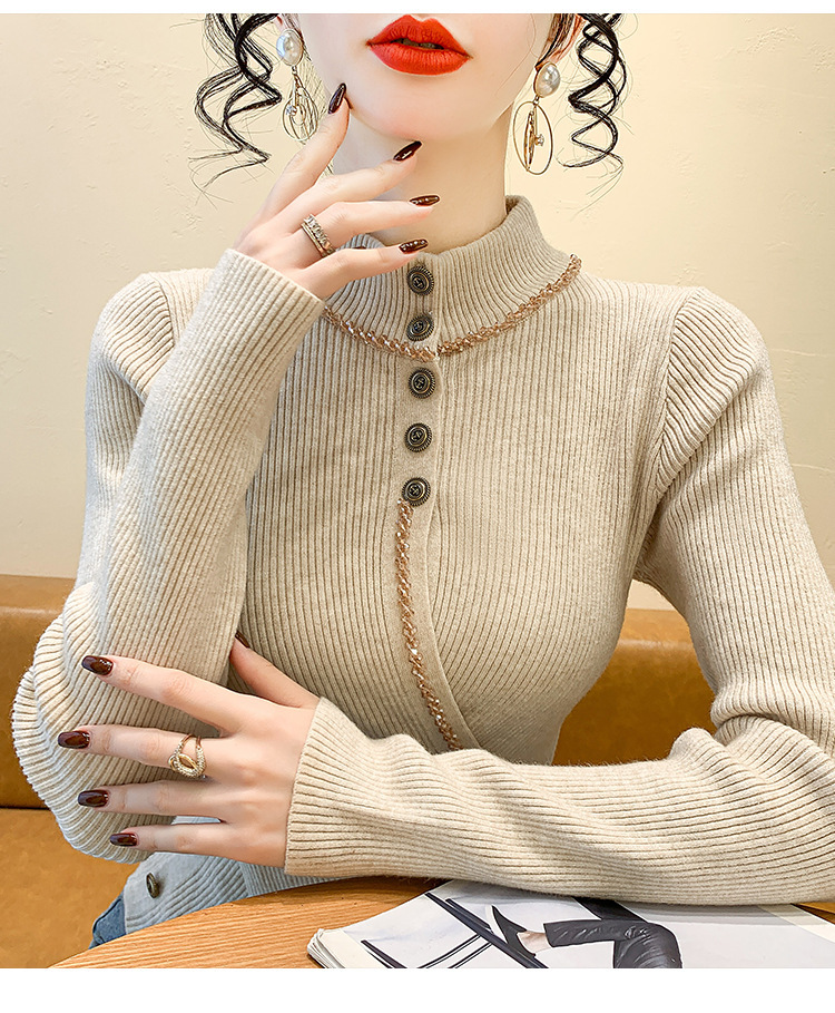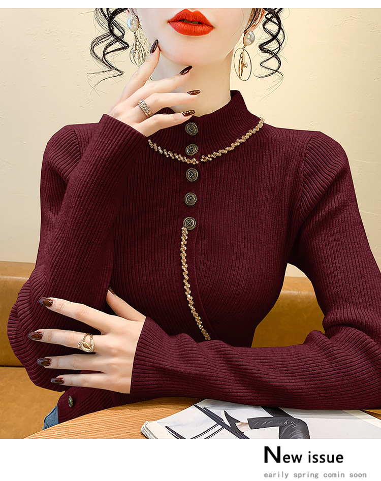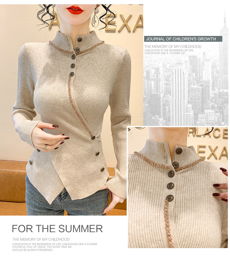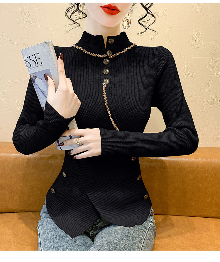 KQL-C410N小香风半高领纽扣开叉毛衣女2024冬季新款别致小众气质针织上衣潮
