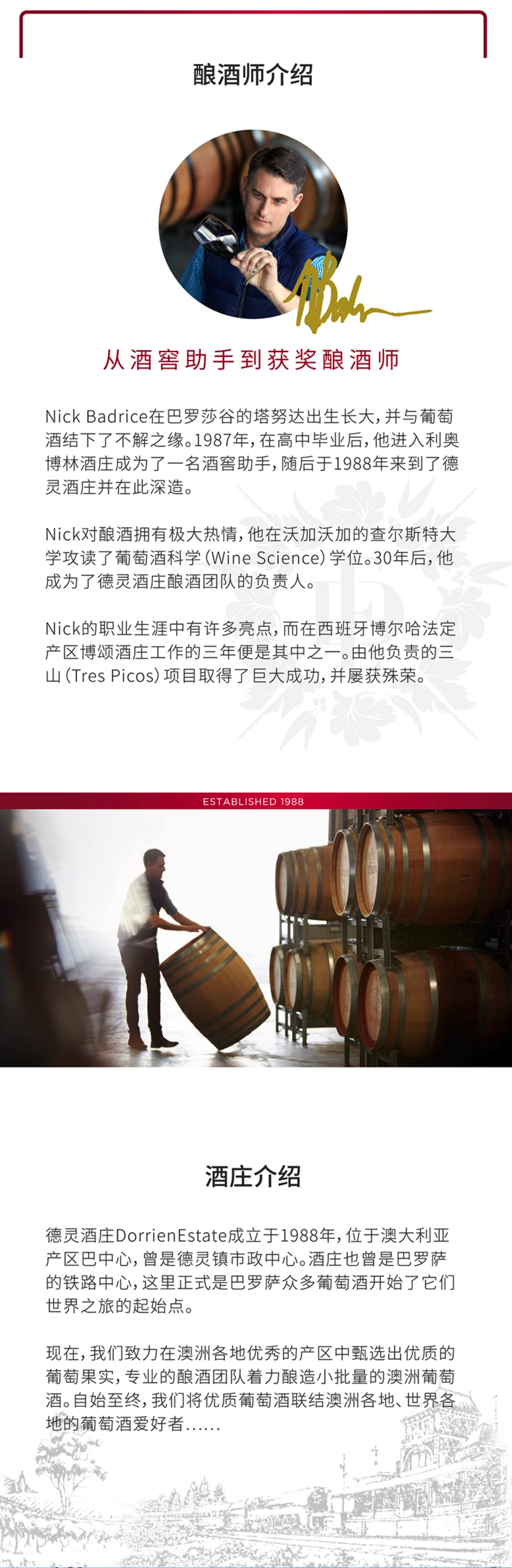 品酒笔记:酒色柔情,深红色泛着紫色的光泽。入口厚实浓郁,红色和黑色浆果香味夹杂着淡淡的辛香味,浓厚的酒体与甜美的梅子风味相碰撞,完美呈现于味蕾。