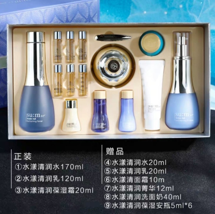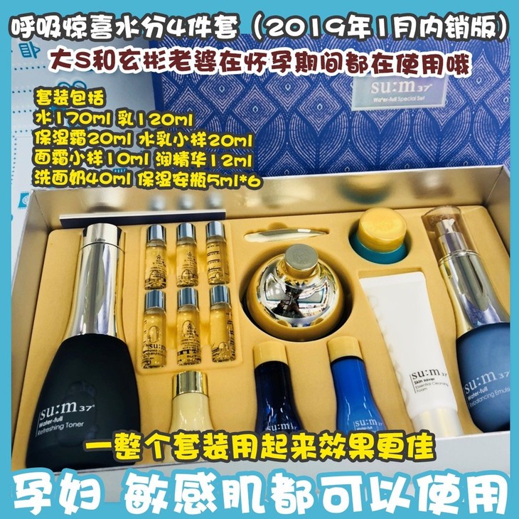 呼吸惊喜水分4件套(2019年1月内销版)👍呼吸惊喜水分可算是明星产品了🕶,就连大S和玄彬老婆在怀孕期间都在使用哦☺!水分真的很足💦,而且一点都不油腻🍃,孕妇、敏感肌都可以使用✅。主打深层补充水分,控制水油平衡〽,改善油皮,镇静肌肤💆,细致毛孔。一整个套装用起来效果更佳💙~套装包括:水170ml➕乳120ml➕保湿霜20ml➕水乳小样20ml➕面霜小样10ml➕润精华12ml➕洗面奶40ml➕保湿安瓶5ml*6