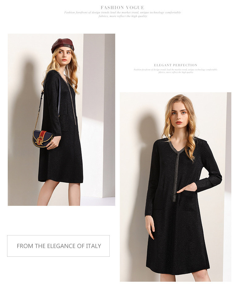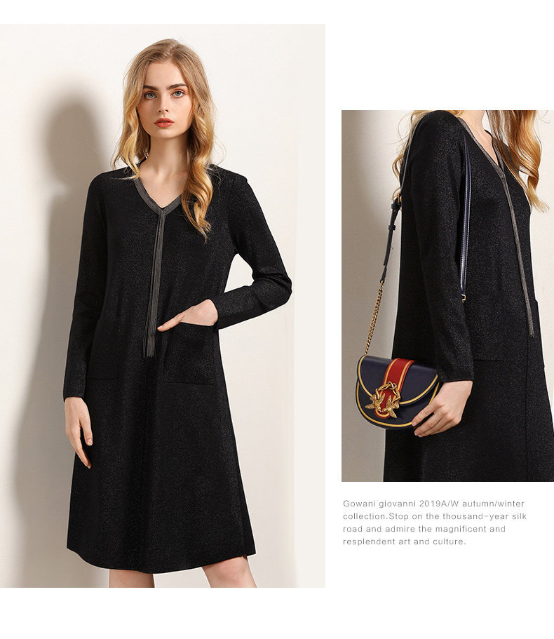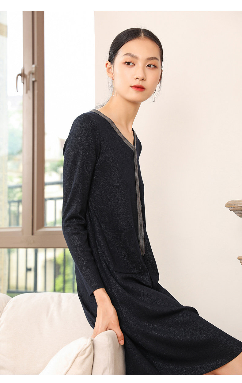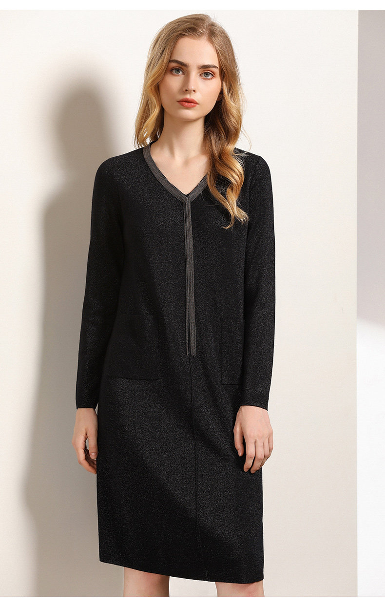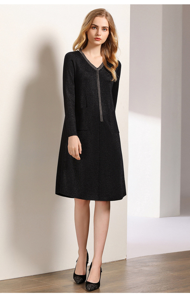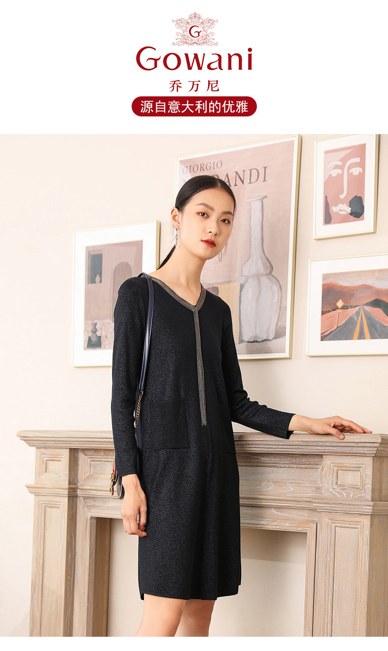 乔万尼秋装女长袖打底衫V领直筒显瘦羊毛针织连衣裙中长EN3M410