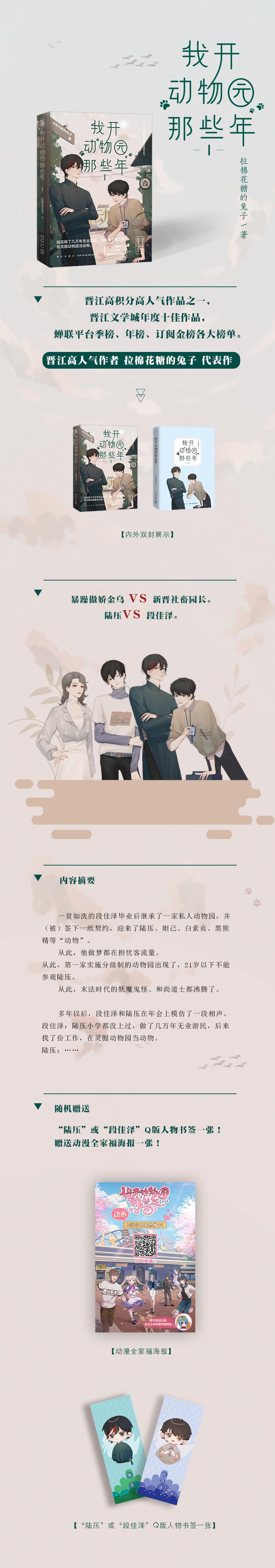 ◎晋江文学城年度作品,114亿积分,30万书评,蝉联平台季榜、年榜、订阅金榜各大榜单。 ◎暴躁傲娇金乌VS新晋社畜园长。陆压VS段佳泽。 ◎晋江大神级作者拉棉花糖的兔子成名之作,现象级作品,开启了“动物园”流派先河。 ◎那年事件记录吧“动物群像奖” ◎同名漫画火热连载,同名广播剧正在热播,同名动漫正在哔哩哔哩热播。 ◎一部凭借读者口口相传的口碑作品。 ◎随机赠送“陆压”或“段佳泽”Q版人物书签一张!赠送动漫全家福海报一张!