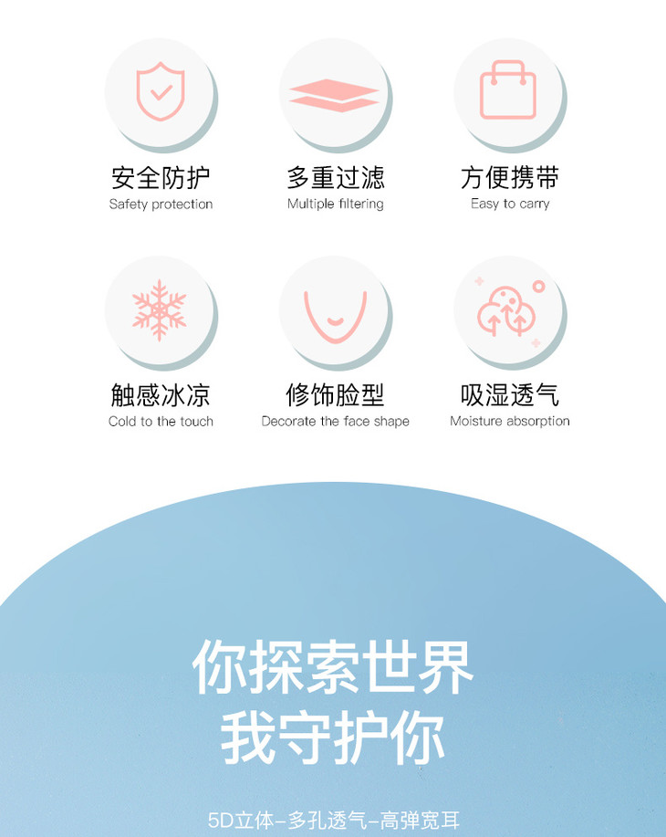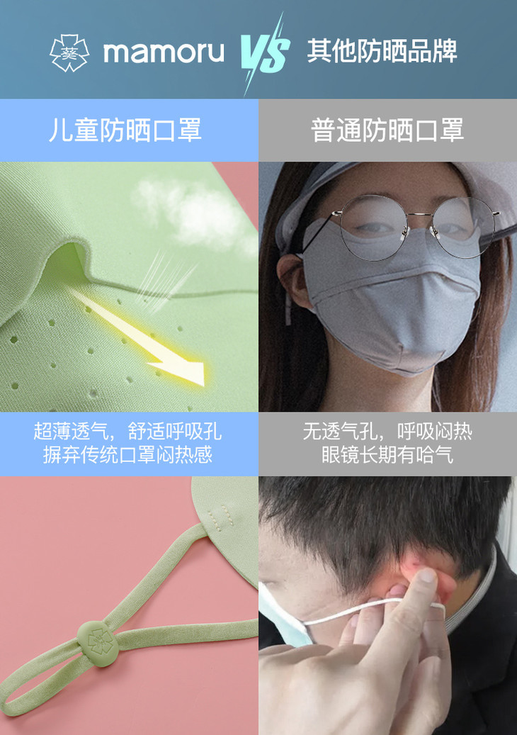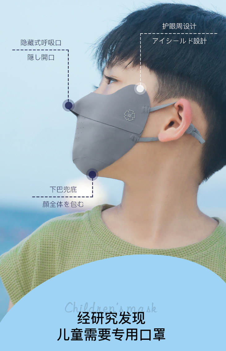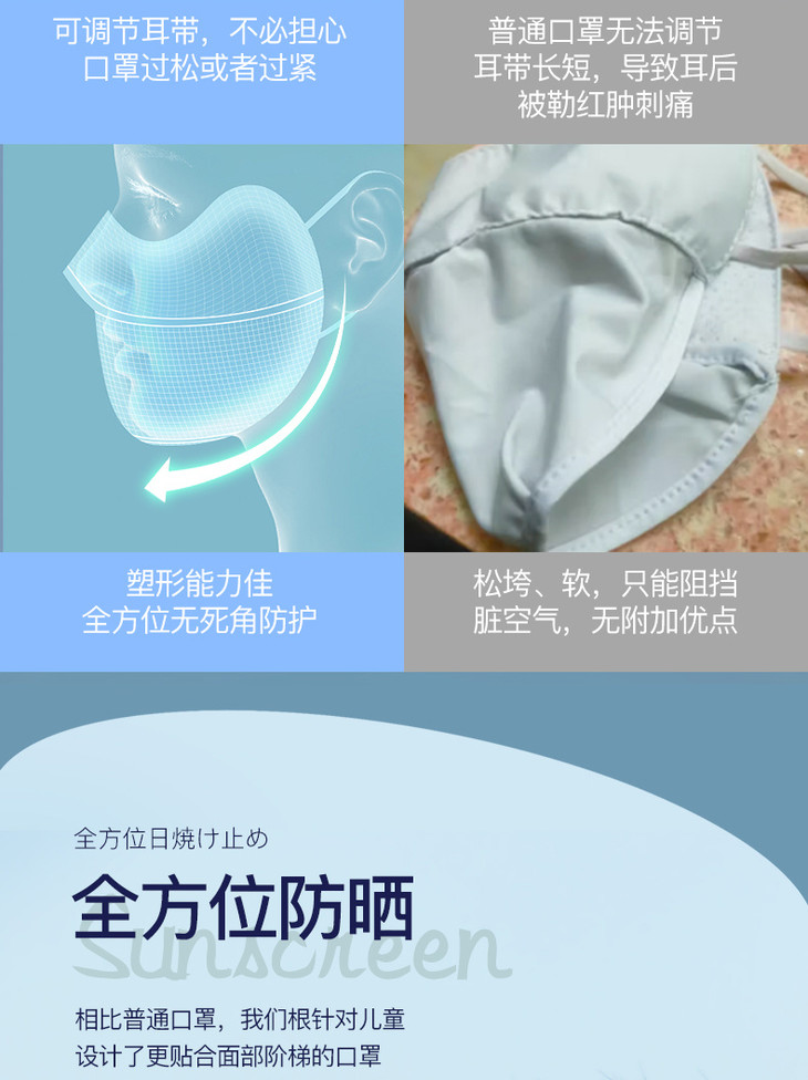 这款防晒口罩无论是儿童款还是成人 的最大卖点就是防晒功能,能够有效阻挡紫外线的侵害, 保护您的皮肤和呼吸系统。随着紫外线的增强, 长时间暴露在太阳下容易造成皮肤过敏、色斑、皱纹、晒伤等问题, 甚至会增加患皮肤癌的风险。 而防晒口罩就能够很好地解决这些问题,为您提供全面的防护和保障。