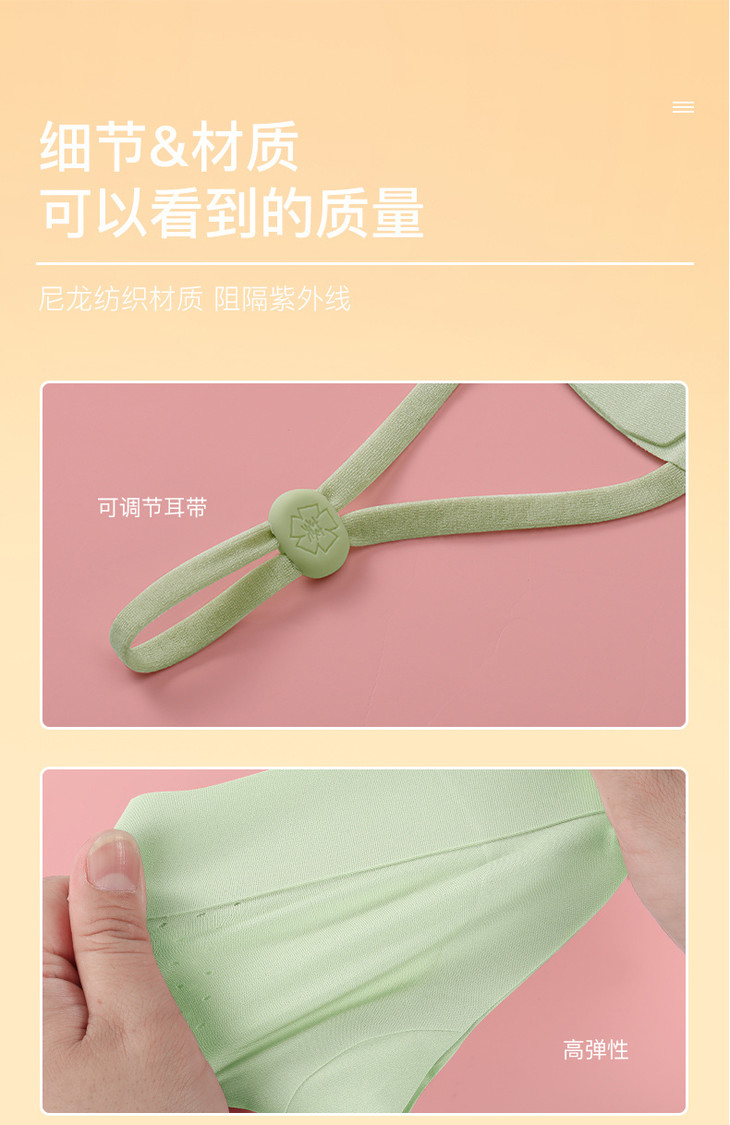 浅绿色防晒口罩是一款非常清新和自然的口罩,适合与各种服装搭配。 绿色是一种非常柔和和自然的颜色,能够显得温暖和舒适,适合在春夏季节穿搭。