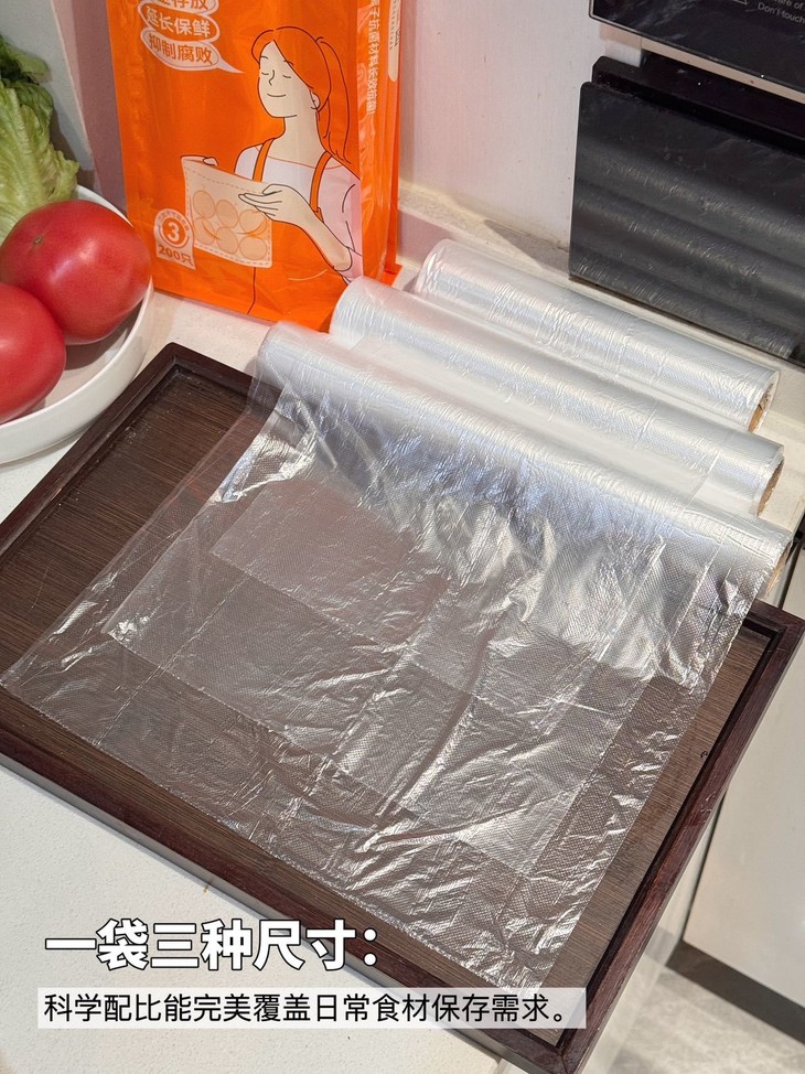30×20cm中号/35×25cm大号/40×30cm特大号,200只组合装覆盖所有收纳场景 食品级材质安全又抗菌,新年囤的水果、蔬菜、肉类用它分装,冰箱瞬间整洁,保鲜效果也拉满~ 点断式设计撕取超顺滑,再也不用跟保鲜袋“较劲”了,新年厨房收纳直接冲!