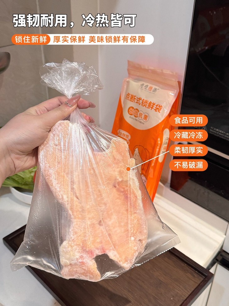 谁懂啊!新年装汤汤水水的卤味,最怕保鲜袋漏了!这款点点橙圆锁鲜袋直接解决我的烦恼~ 加厚材质柔韧性拉满,使劲攥紧、拉伸都不会破洞撕裂,防漏锁鲜效果绝了! 点断式设计撕取超方便,一袋还有三种尺寸,从分装小水果到收纳整只鸡都合适。 食品级+银离子抗菌,新年囤的食材用它装,安心又保鲜,厨房党直接冲!