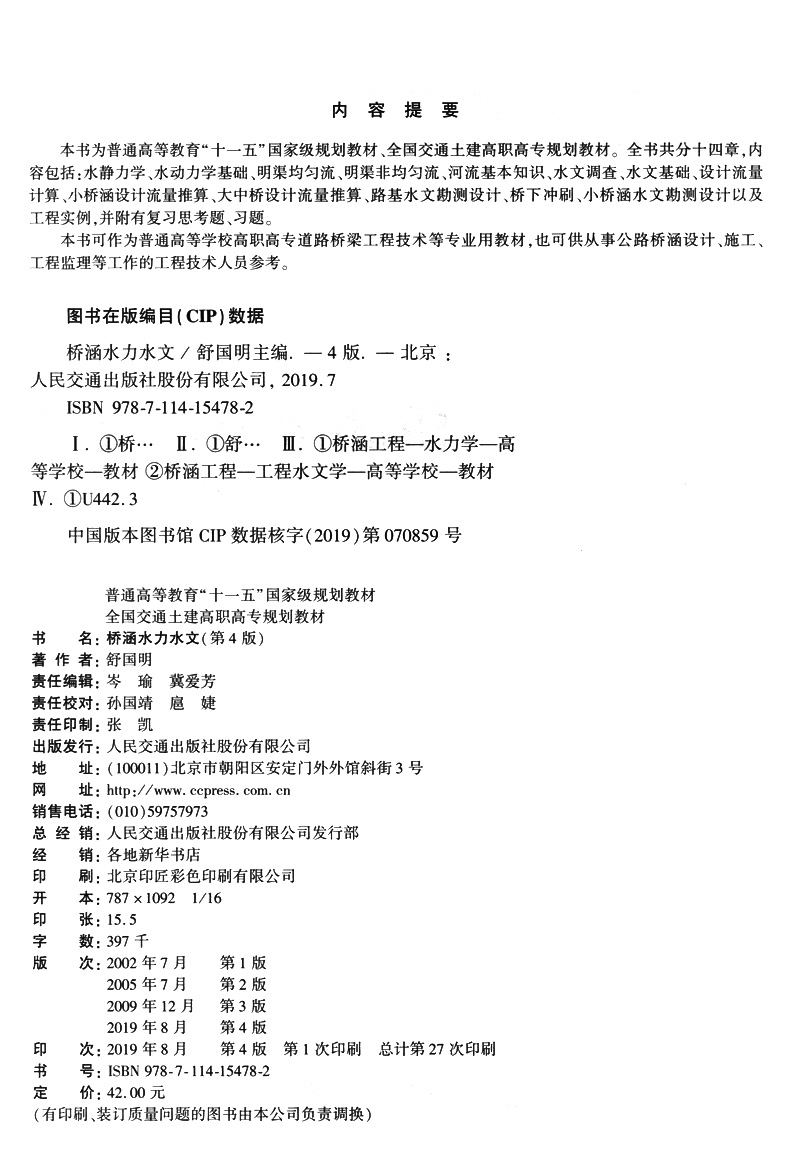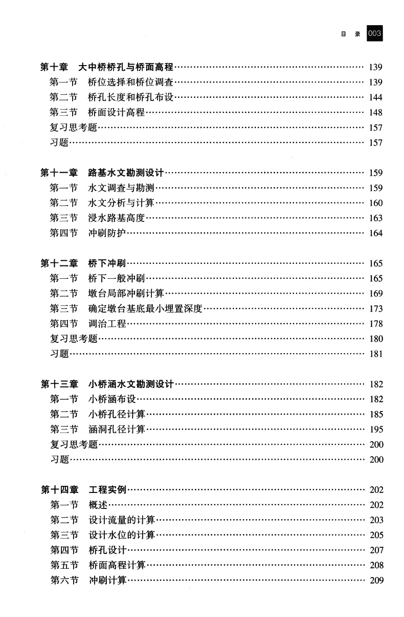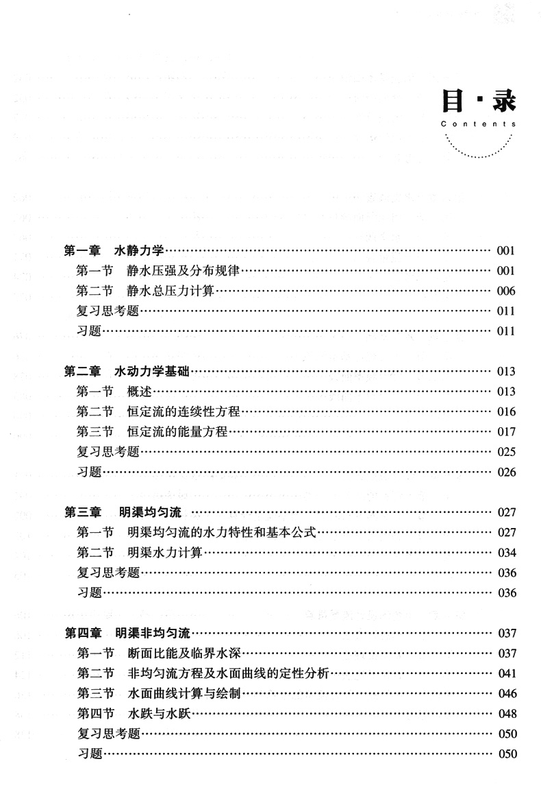 全书共十三章,主要包括水静力学、水动力学基础、明渠均匀流、明渠非均匀流、河流基本知识、水文调查、水文基础、大中桥设计流量推算、小桥涵设计流量推算、桥位选择与大中桥孔径计算、桥下冲刷、小桥涵孔径计算以及工程案例,并附有复习思考题、习题。