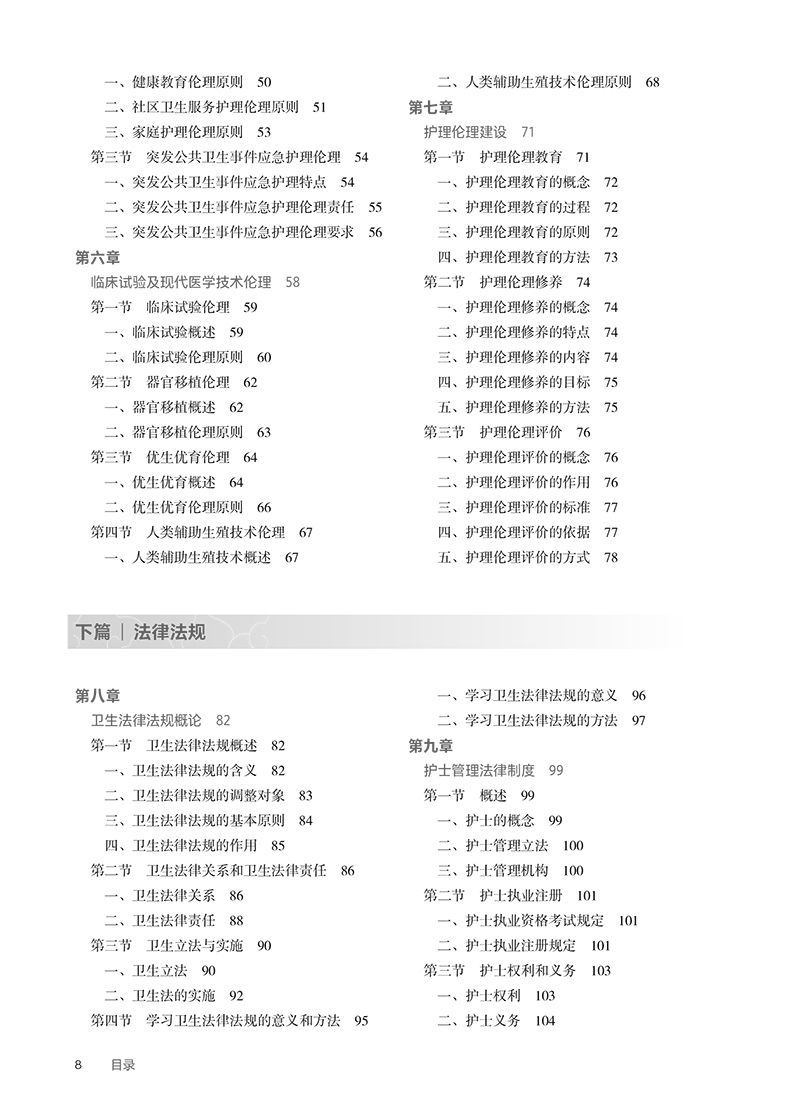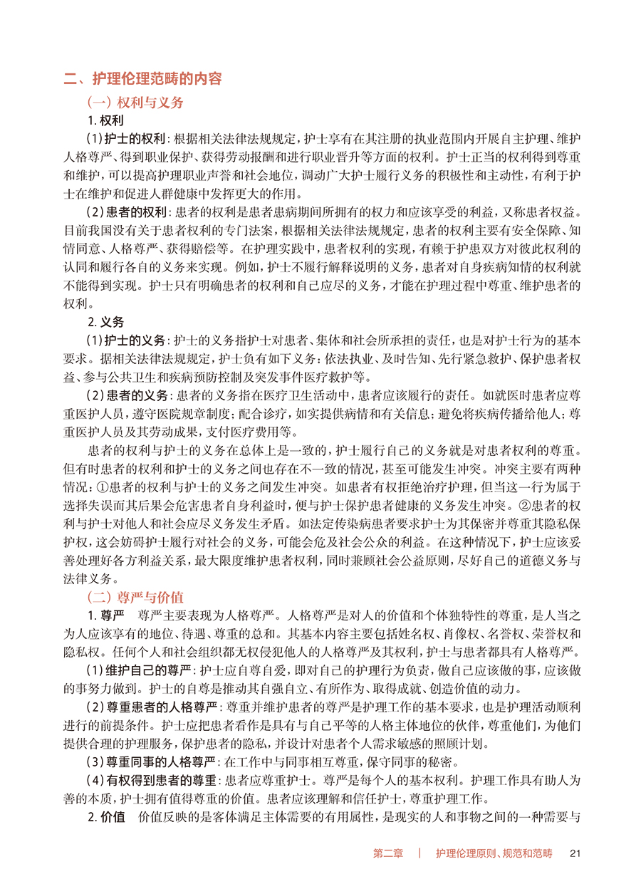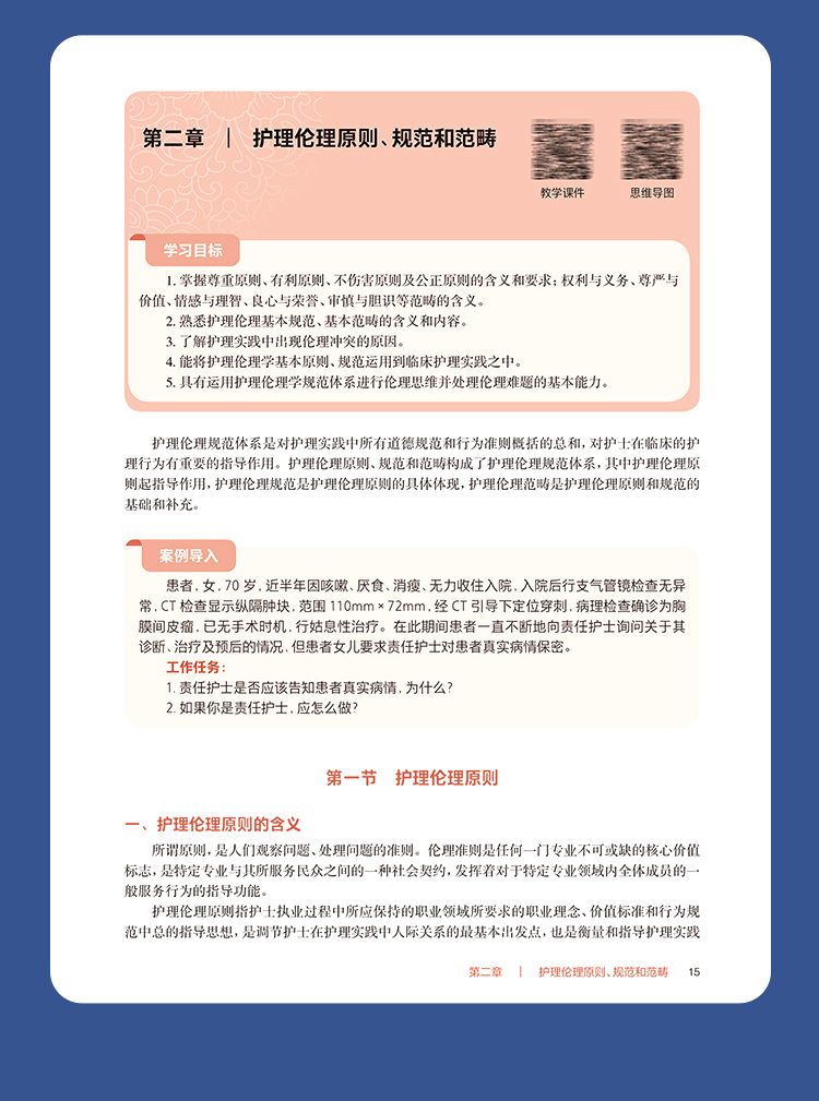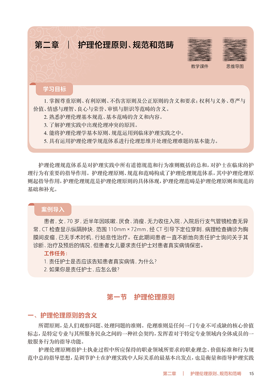 护理工作是我国卫生健康事业的重要组成部分,对全面推进健康中国建设具有重要意义。护理道德素质和卫生法治素养是培养合格护理人才、推动护理质量提升的重要内容。《“健康中国2030”规划纲要》要求:持续改进医疗质量和医疗安全……加强医疗服务人文关怀,构建和谐医患关系。《国家职业教育改革实施方案》指出:深化办学体制改革和育人机制改革;推进高等职业教育高质量发展;促进职业院校加强专业建设、深化课程改革、增强实训内容、提高师资水平,全面提升教育教学质量。《全国护理事业发展规划(2021—2025 年)》提出:进一步加强护士队伍建设,丰富护理服务内涵与外延,提升护理管理水平;不断规范从业人员实践行为;把提高护理服务质量和水平作为核心任务等。党的二十大报告提出:要推进健康中国建设,把保障人民健康放在优先发展的战略位置。为适应经济社会发展对护理事业发展的新要求,贯彻落实护理职业教育改革,落实立德树人根本任务,加强护士队伍建设,学习护理伦理与法律法规是提升护理道德素质和卫生法治素养的重要途径,因此对本教材及时修订。 本教材包括护理伦理与法律法规上、下两篇,全书共十一章。本教材深入贯彻落实党的二十大精神,以立德树人为宗旨,以人才培养为目标,以人文理念为导向,突出三个特点。一是新颖性,教材吸收了近年来护理伦理、健康促进等新内容,以及医疗纠纷预防、医疗损害赔偿等法律规定。二是科学性,教材充分考虑高等职业教育专科护理、助产专业的特点,贴近专业实际,编写体系合理,内容详略得当,文字通俗简练,难度深浅适宜,注重价值指引。三是实用性,教材在讲授基本理论的基础上,密切结合护理伦理与法律法规实践及护士执业资格考试,注重培养学生的综合素质和执业能力。 本教材在编写过程中,得到了编者所在单位的大力支持,也查阅和参考了许多专家编著的教材等研究成果,在此一并表示诚挚的谢意。由于编者能力所限,书中难免存在不妥之处,敬请各位同仁和读者给予批评指正。 钟会亮 吕 慕 2024 年9 月