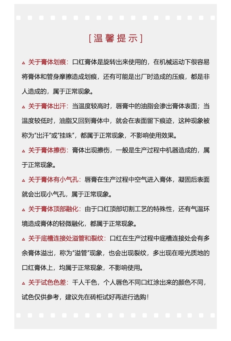 受不同唇色、光线及不同显示器的影响,口红涂抹效果会有所差异哦~