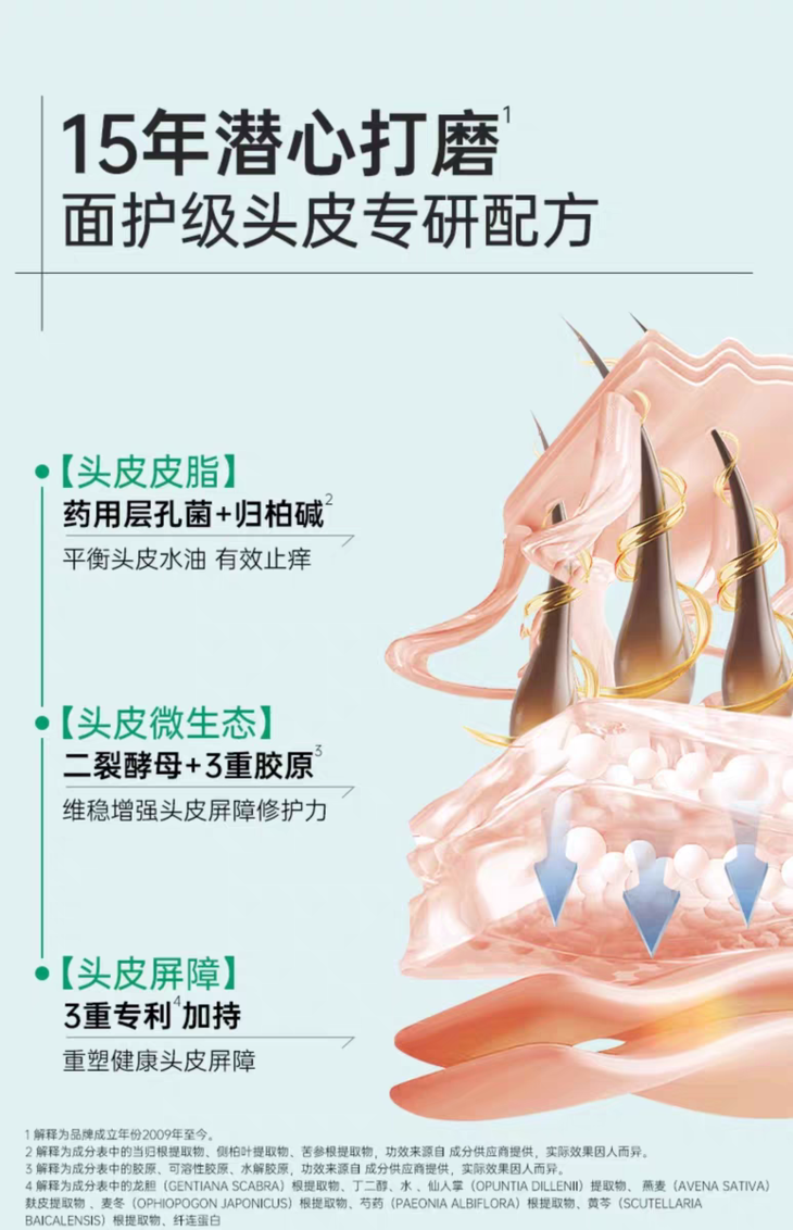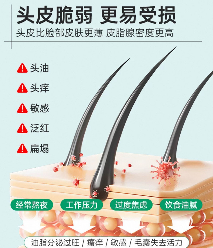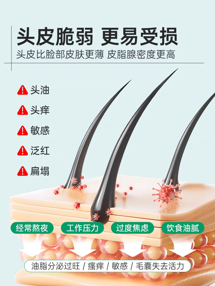 很多人面对头皮问题能想到的就是:勤洗头!换那种去油去屑防脱的洗发水! 令人扎心的真相是,这个做法治标不治本,还会破坏头皮本身的平衡,刺激后更容易出油和掉发! 其实头屑、头油、头痒、头皮长痘痘,多半是头皮屏障受损,头皮敏感脆弱导致的。 所以我们不能一味的选择清洁力强的洗发水,而是应该从根源解决问题!