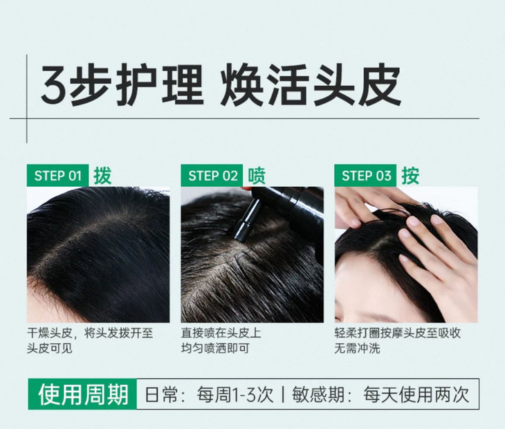 ⚠️建议按照产品说明的频率 使用头皮精华一般为每周1-3次, 如果是敏感期, 可以在敏感的地方 比如泛红瘙痒的区域一天使用两次, 直至敏感症状改善👏🏻 具体可根据个人头皮状况和需求调整。 持之以恒地使用,能够显著改善头皮健康状况‼️