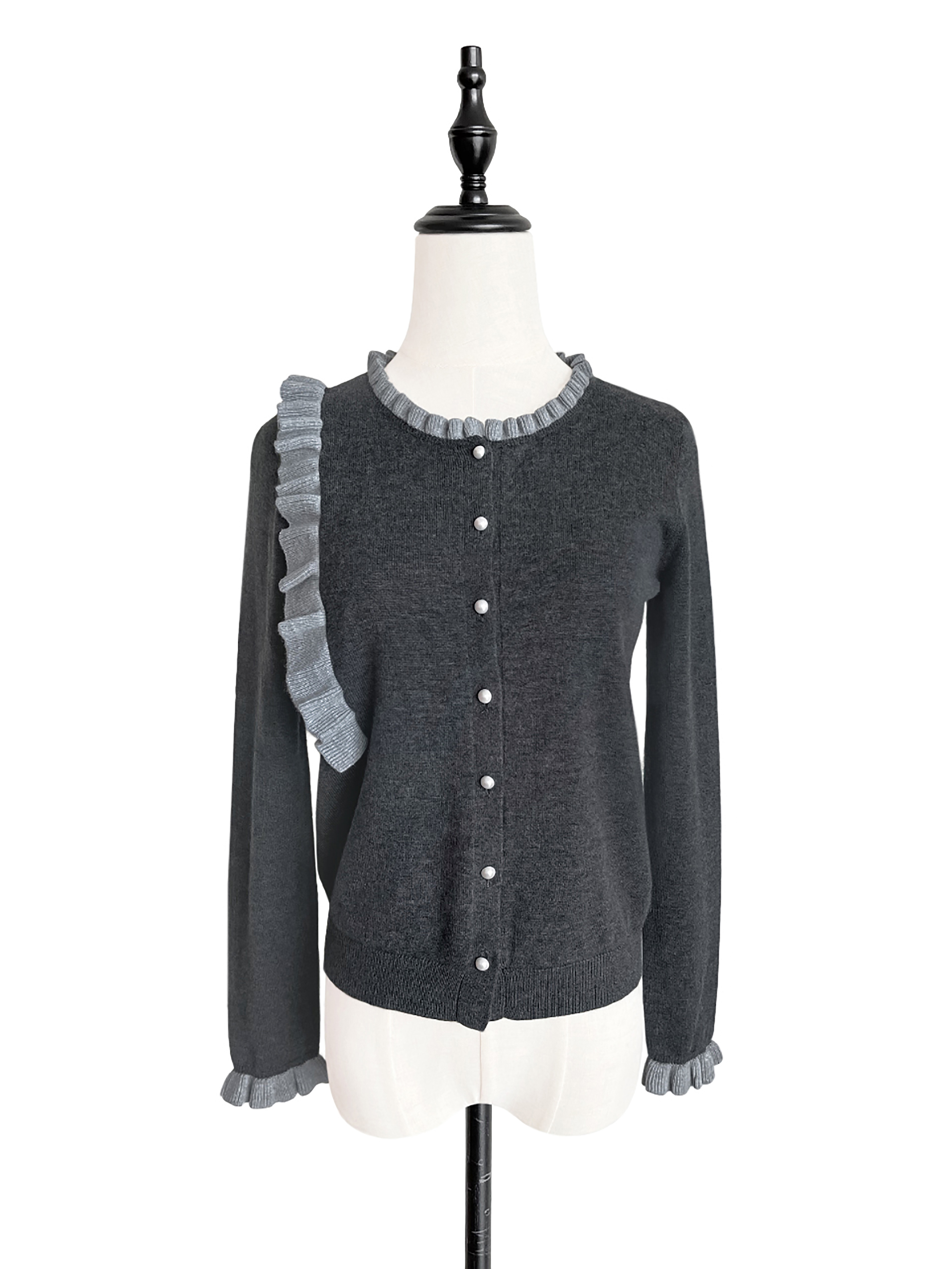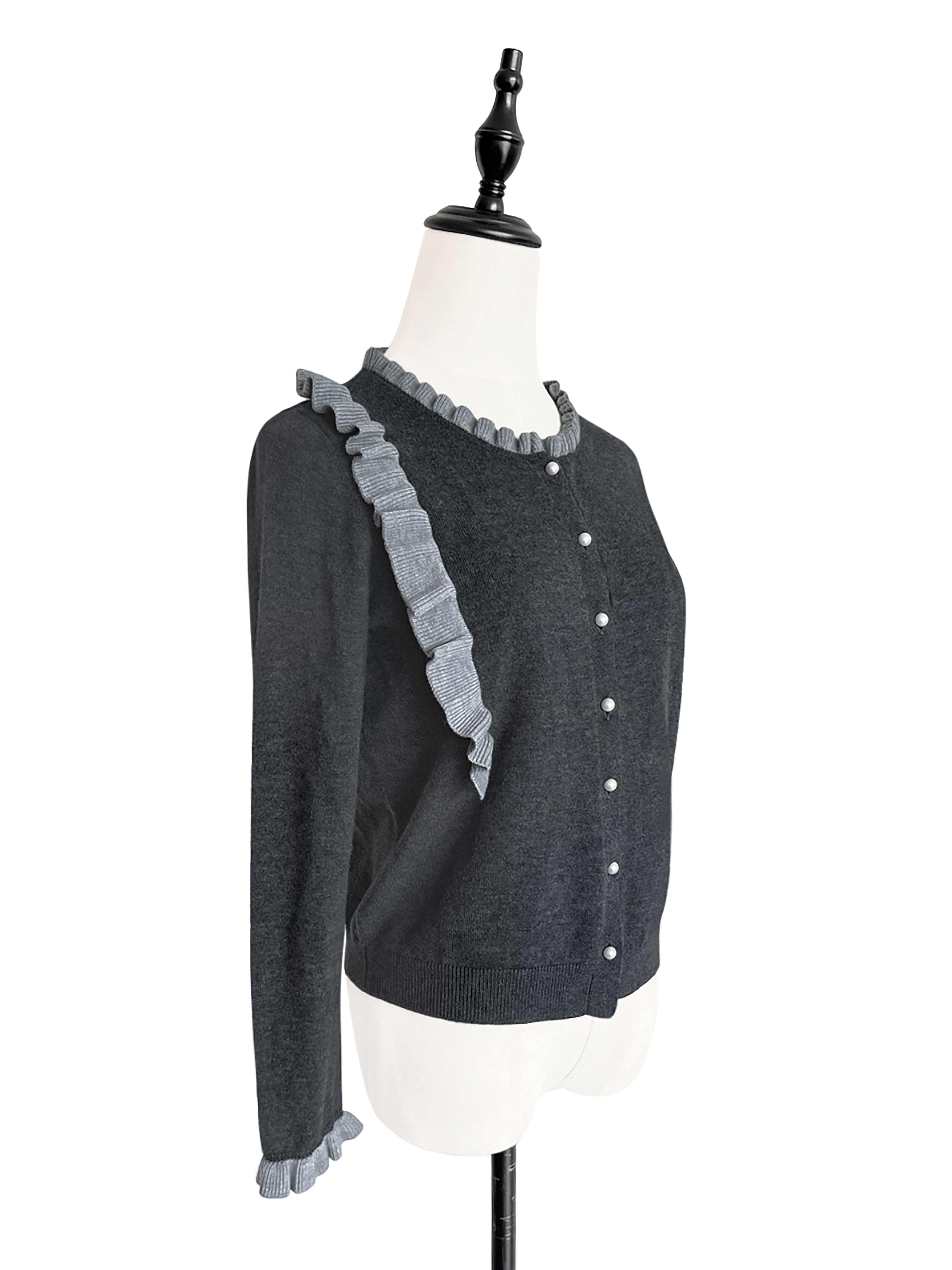 TYNVIE 撞色荷叶边珍珠纽扣开襟针织衫- 深蓝色