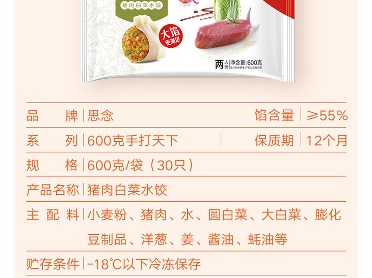 思念 手打天下 猪肉白菜水饺 600g 30只 饺子 早餐食材 煎饺 蒸饺 烧烤