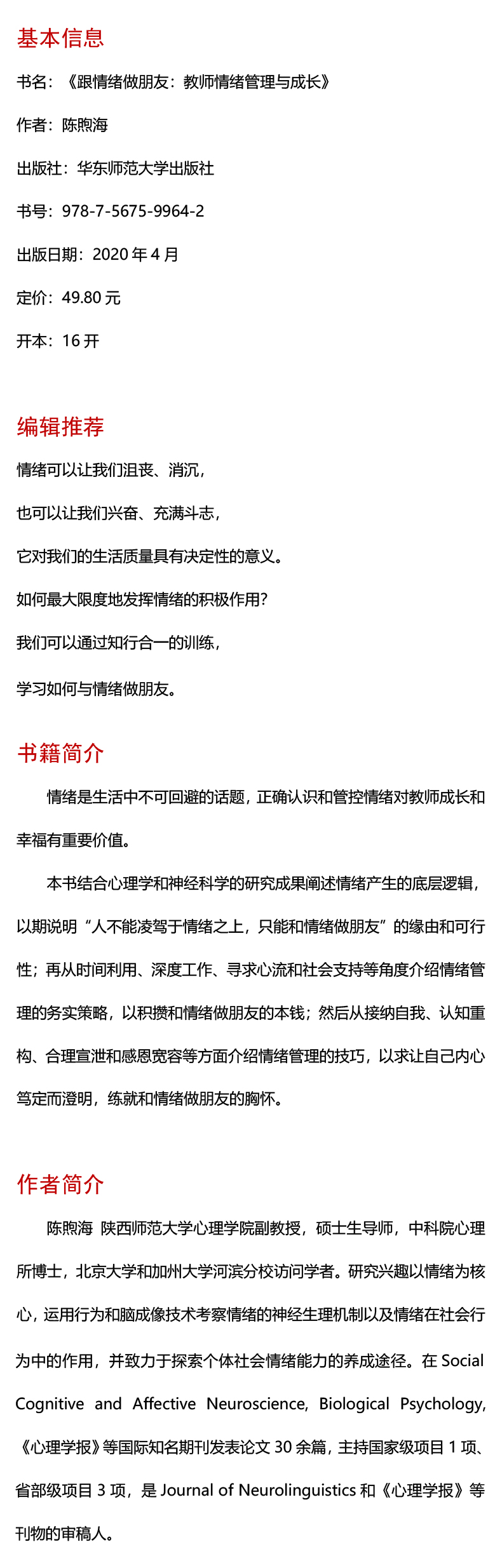情绪是生活中不可回避的话题,正确认识和管控情绪对教师成长和幸福有重要价值。本书结合心理学和神经科学的研究成果阐述情绪产生的底层逻辑,以期说明“人不能凌驾于情绪之上,只能和情绪做朋友”的缘由和可行性;再从时间利用、深度工作、寻求心流和社会支持等角度介绍情绪管理的务实策略,以积攒和情绪做朋友的本钱;然后从接纳自我、认知重构、合理宣泄和感恩宽容等方面介绍情绪管理的技巧,以求让自己内心笃定而澄明,练就和情绪做朋友的胸怀。