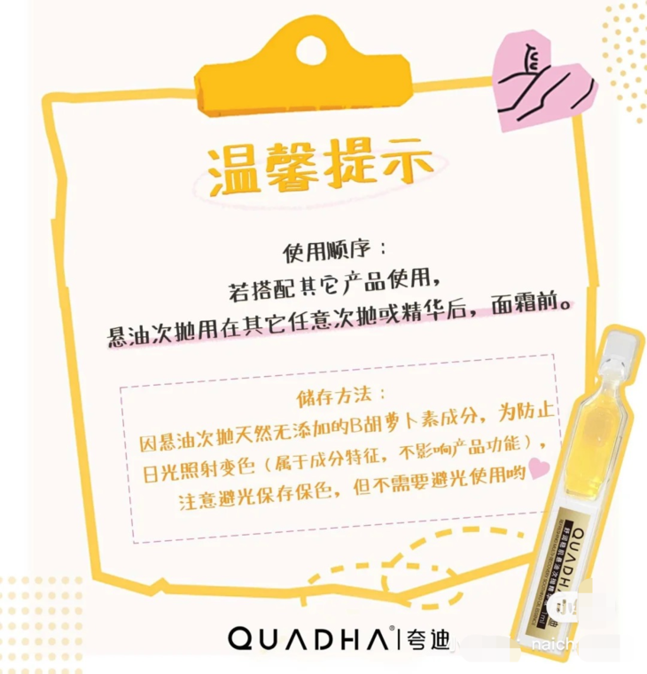 请先在耳后或手腕处测试是否有皮肤敏感成分,如有过敏反应请用大量清水冲洗并立即停止使用。
