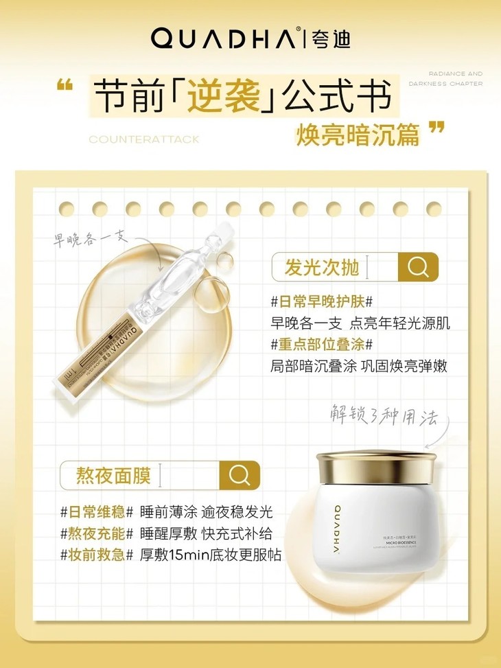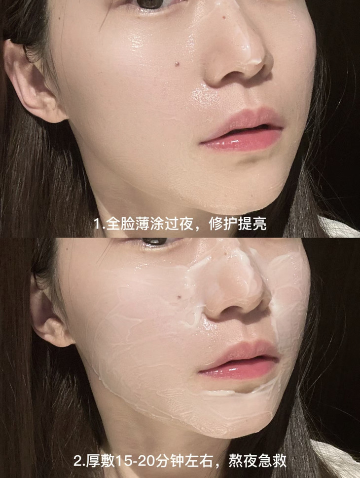 1️⃣ 日常提亮修护:全脸薄涂一层过夜,隔天起来皮肤饱满又透亮!