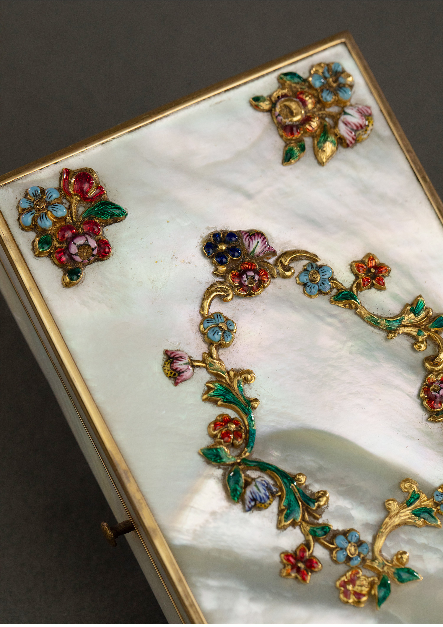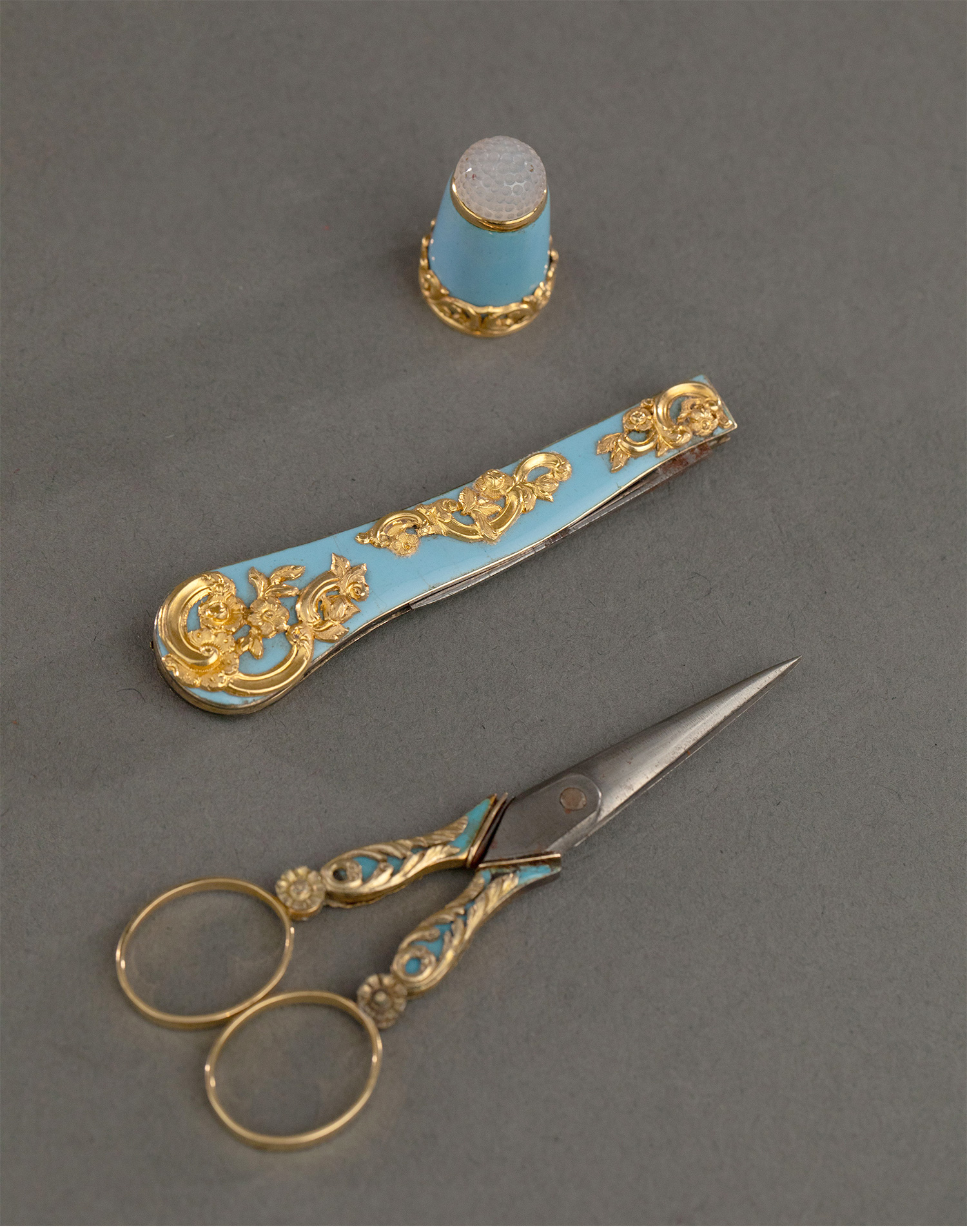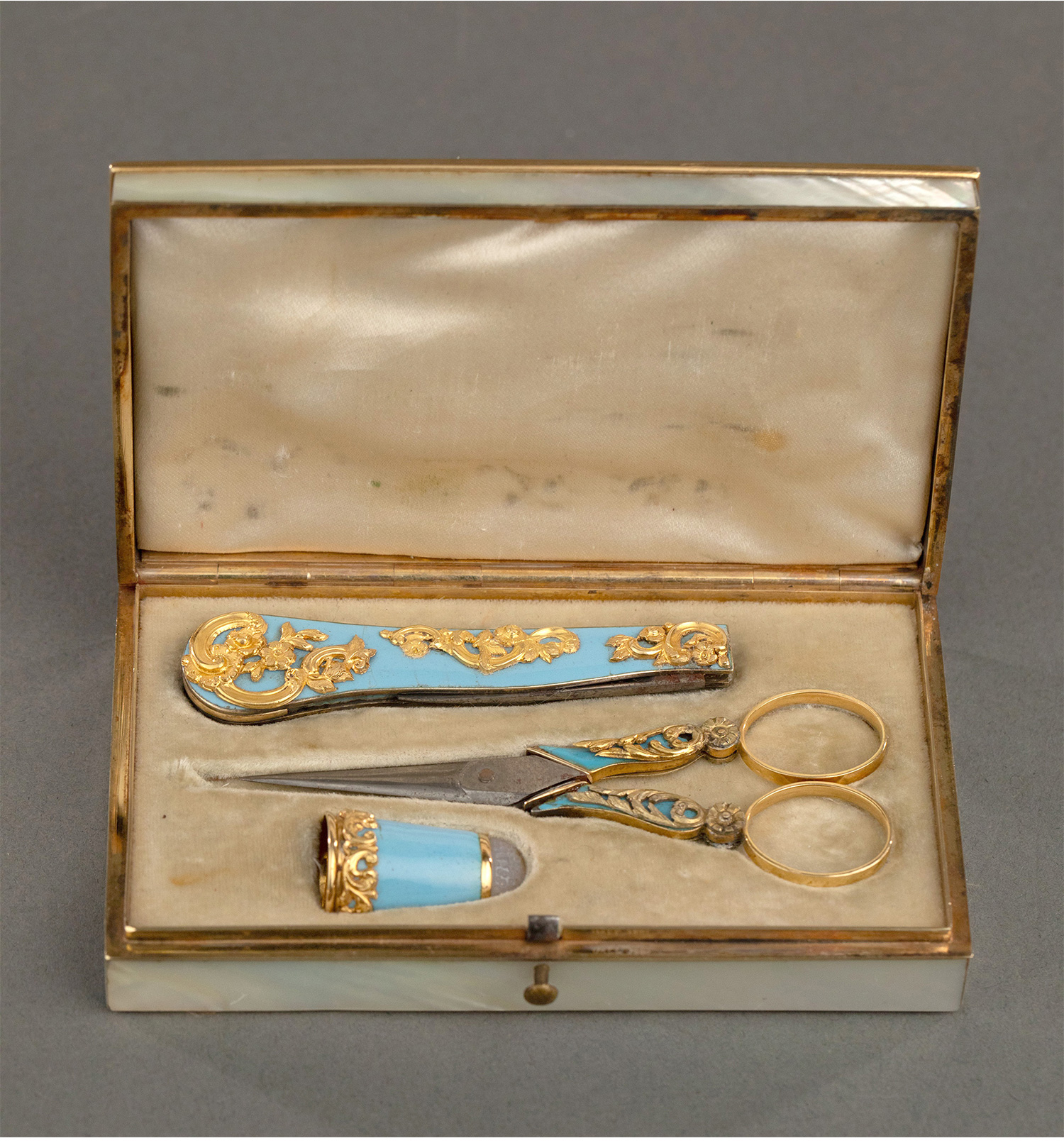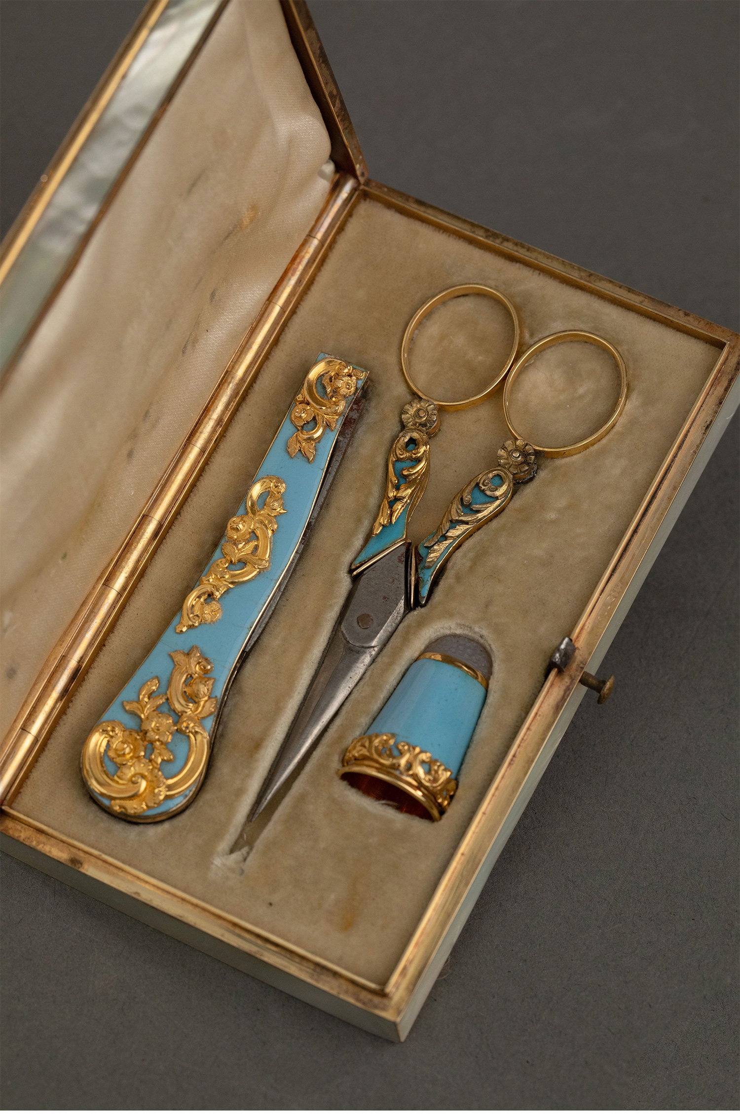 19世纪法国出品花卉主题14K黄金精雕装饰珐琅嵌母贝外盒与卷叶纹18K金雕钢制用具淑女缝纫套件